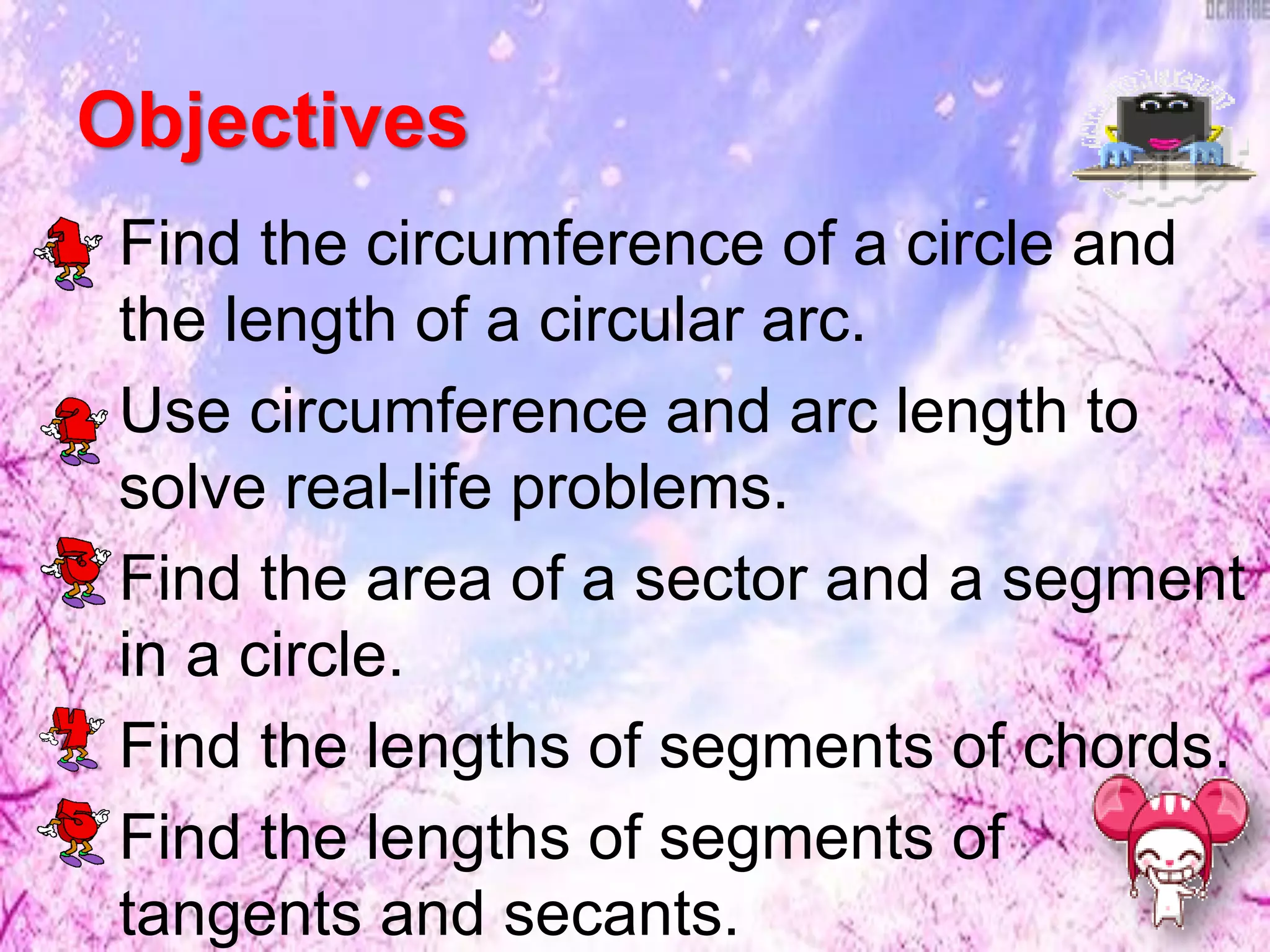 This document discusses finding lengths of arcs, chords, segments, and circumferences in circles. It defines circumference as 2πr and arc length as (degree measure of arc/360) × 2πr. Examples show calculating circumference, arc length, and using theorems like chord-product and secant-tangent to find unknown segment lengths. The key ideas are that circumference is proportional to diameter/radius and arc length is proportional to its central angle measure. Various geometry problems demonstrate applying these circle concepts.