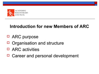 The document summarizes the Annual Conference 2012 of the Academic Registrars' Council (ARC). ARC is a membership organization for Academic Registrars that aims to promote best practices, provide professional development, and represent its members. The conference introduced new members to ARC's purpose and activities. ARC is organized through an executive committee and practitioner groups. It provides career development opportunities for members through various events, forums, and peer support.
