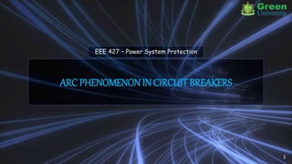 This document discusses arc phenomenon in circuit breakers. It describes that an arc occurs when contacts open during a short circuit, as the potential difference maintains ionized particles between contacts. There are two main methods to extinguish the arc: high resistance, by lengthening/cooling the arc to increase resistance; and low resistance, by recombining or sweeping away ionized particles to reduce conductivity. The key factors in arc extinction are potential difference, ionization level, and separation distance of contacts during opening.