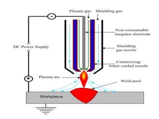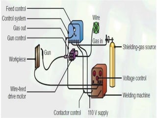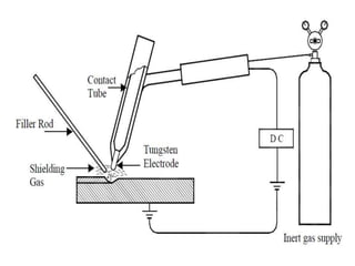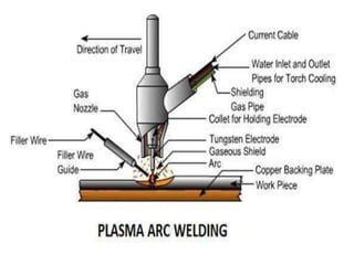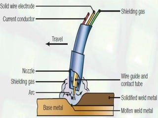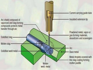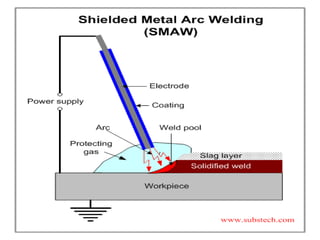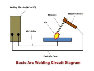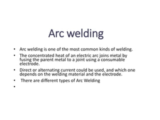 Arc welding is a popular welding method that uses an electric arc to fuse metals, employing various techniques such as Gas Metal Arc Welding (GMAW), Gas Tungsten Arc Welding (GTAW), and Submerged Arc Welding (SAW). Each type has distinct advantages; for instance, GMAW is economical and easy to automate, while SAW allows for deeper heat penetration and higher productivity. The document outlines specific characteristics, applications, and benefits of each welding technique.