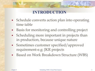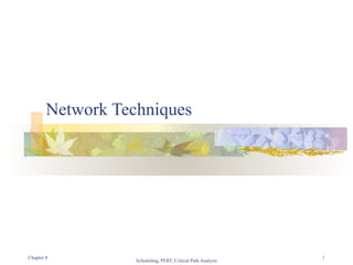 This document discusses network techniques like PERT (Program Evaluation and Review Technique) and CPM (Critical Path Method) which are used for scheduling projects. It provides examples of networking activities with earliest and latest start/finish times to identify the critical path. The critical path is the longest path through the network that determines the minimum project duration. Non-critical activities have float or slack time and can be delayed without extending the project completion time. The document also discusses using three time estimates (optimistic, most likely, pessimistic) for activities when there is uncertainty to calculate the expected duration and variance for each activity in a PERT network.