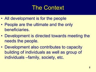 1. All development is for the benefit of people, and population characteristics like size, age, and sex determine development needs. Development also modifies population factors.