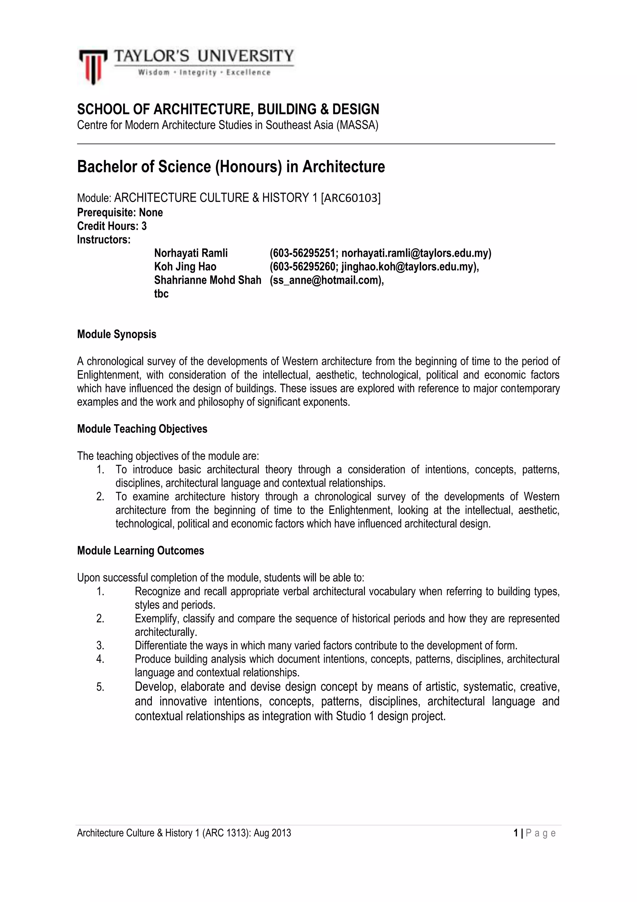 This document provides information about the Architecture Culture & History 1 module offered at Taylor's University. The module is a 3-credit course taught over 14 weeks through lectures, tutorials, and self-study. It aims to introduce students to architectural theory and examine the history of Western architecture from early times to the Enlightenment period. Students will learn about factors influencing architectural design and be able to analyze buildings. Assessment includes class participation, assignments, and a final exam. Attendance of 80% is required to pass, and late submissions are subject to penalties.