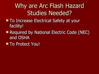 This document discusses arc flash hazard calculations and their importance for electrical safety. It outlines OSHA and NFPA regulations requiring employers to identify electrical hazards and protect workers through appropriate personal protective equipment. Key steps in performing an arc flash hazard analysis include short circuit, protective device coordination, and arc flash studies to determine incident energy levels and necessary PPE based on NFPA tables. Warning labels communicating these hazards must be applied to electrical equipment.