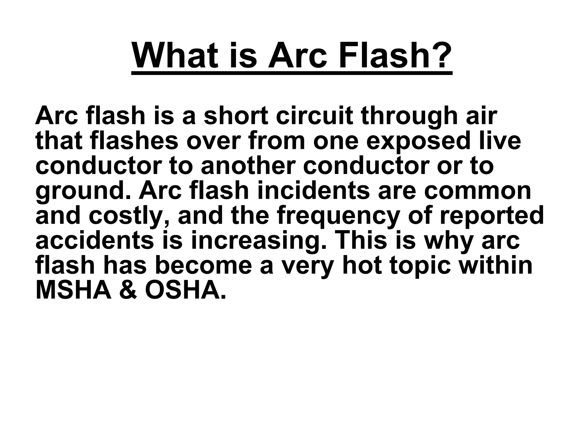 Arc flash is a short circuit through air caused by a flashover between exposed live conductors or to ground. Arc flash incidents are common, costly, and increasing in reported accidents. Arc flashes can be caused by proximity to high-amp sources, sparks from tools or equipment failures, breaks in insulation, or impurities on conductors. Most electrical burns come from arc flash, not shocks. Approximately 350 people are killed by electricity annually in the workplace, with around 50% related to arc flash. Proper training, risk analysis, and personal protective equipment are needed to understand and mitigate arc flash hazards.