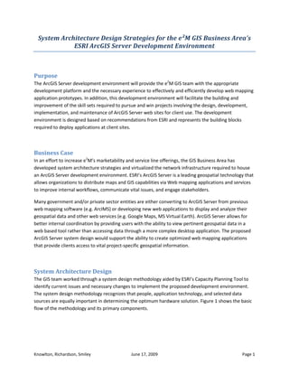The document describes plans to establish an ArcGIS Server development environment to help the e2M GIS team develop web mapping applications and pursue client projects. It discusses selecting a two-tier or three-tier system architecture based on bandwidth, hardware, and licensing requirements. The development environment will not be a production environment due to limitations but will provide experience. A phased deployment approach is recommended to reduce risks.