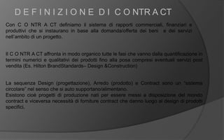 Il documento esplora l'interazione tra design, arredo e retail nel contesto della produzione e vendita di beni, evidenziando come un approccio circolare tra progettazione e forniture contract possa rispondere alle esigenze di un mercato in evoluzione. Si discute l'importanza del retail design nel facilitare nuove forme di comunicazione commerciale e coinvolgimento del consumatore, evolvendosi da mera vendita a esperienze relazionali. Infine, il testo sottolinea la crescente necessità di emozionalità e personalizzazione nella strategia di vendita, trasformando il luogo di consumo in spazi di socializzazione e cultura.