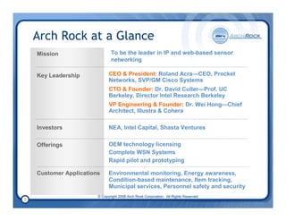 Arch Rock provides wireless sensor network solutions based on 6LoWPAN and IP networking standards. Their technology allows sensors to connect to the internet using low-power wireless mesh networks. They offer IP nodes, routers, and servers to build scalable wireless sensor networks for applications like environmental monitoring, asset tracking, and smart city infrastructure. Arch Rock's solutions leverage open standards to provide ease of deployment, management, and integration with existing IP networks and enterprise systems.