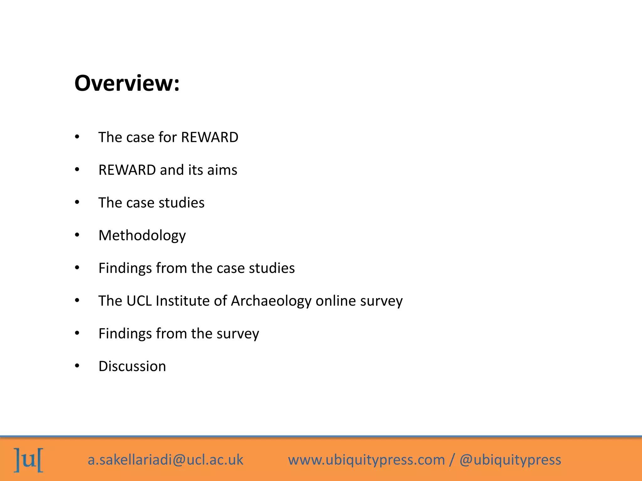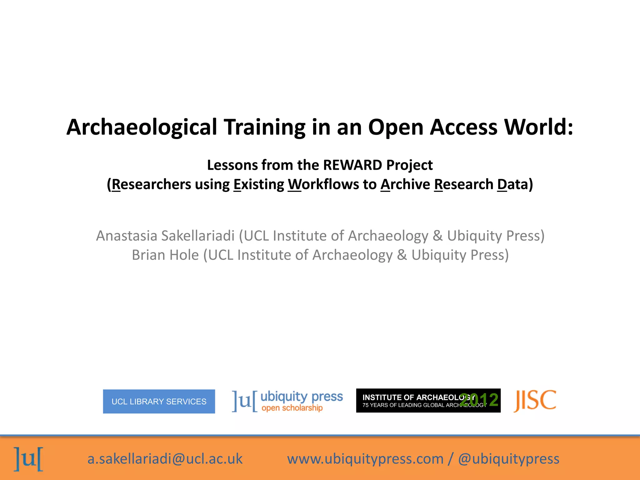 The document discusses the REWARD project aimed at enhancing data archiving practices in archaeology through an assessment of researchers' workflows and data preservation needs. It reveals a significant disparity between the acknowledgement of the importance of data sharing and the actual practices, with many researchers storing data on personal devices instead of digital archives. Findings from case studies and surveys indicate a need for integrating data management into research workflows, alongside incentives and training, to promote better data sharing among academics.
