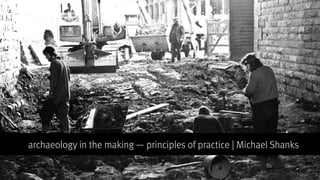 This document discusses principles for archaeological practice, suggesting that archaeology move away from rigid narratives and models towards a more pragmatic and action-oriented approach. It argues that archaeology should focus on performance, discourse, and collaboration. Some key aspects of this pragmatic approach include mimetics, mediation, reenactment, dramaturgy, improvisation, embodied knowledge, memory, and simulation. Overall, the document advocates starting projects in medias res with a collaborative team focused on creative exploration through play, risk taking, and being willing to fail and try again.