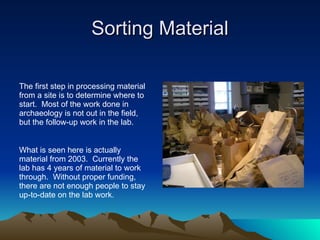 The document discusses the essential processes involved in laboratory work after archaeological fieldwork, emphasizing sorting, labeling, weighing, and cataloging artifacts. It highlights the labor-intensive nature of sifting materials and the need for expert assistance in examining certain items, such as bones. Additionally, it touches on experimental archaeology, showcasing experiments conducted with replicas to gain insights into ancient practices.
