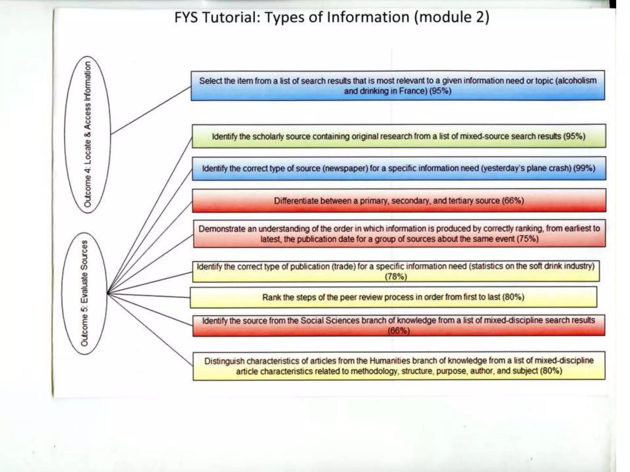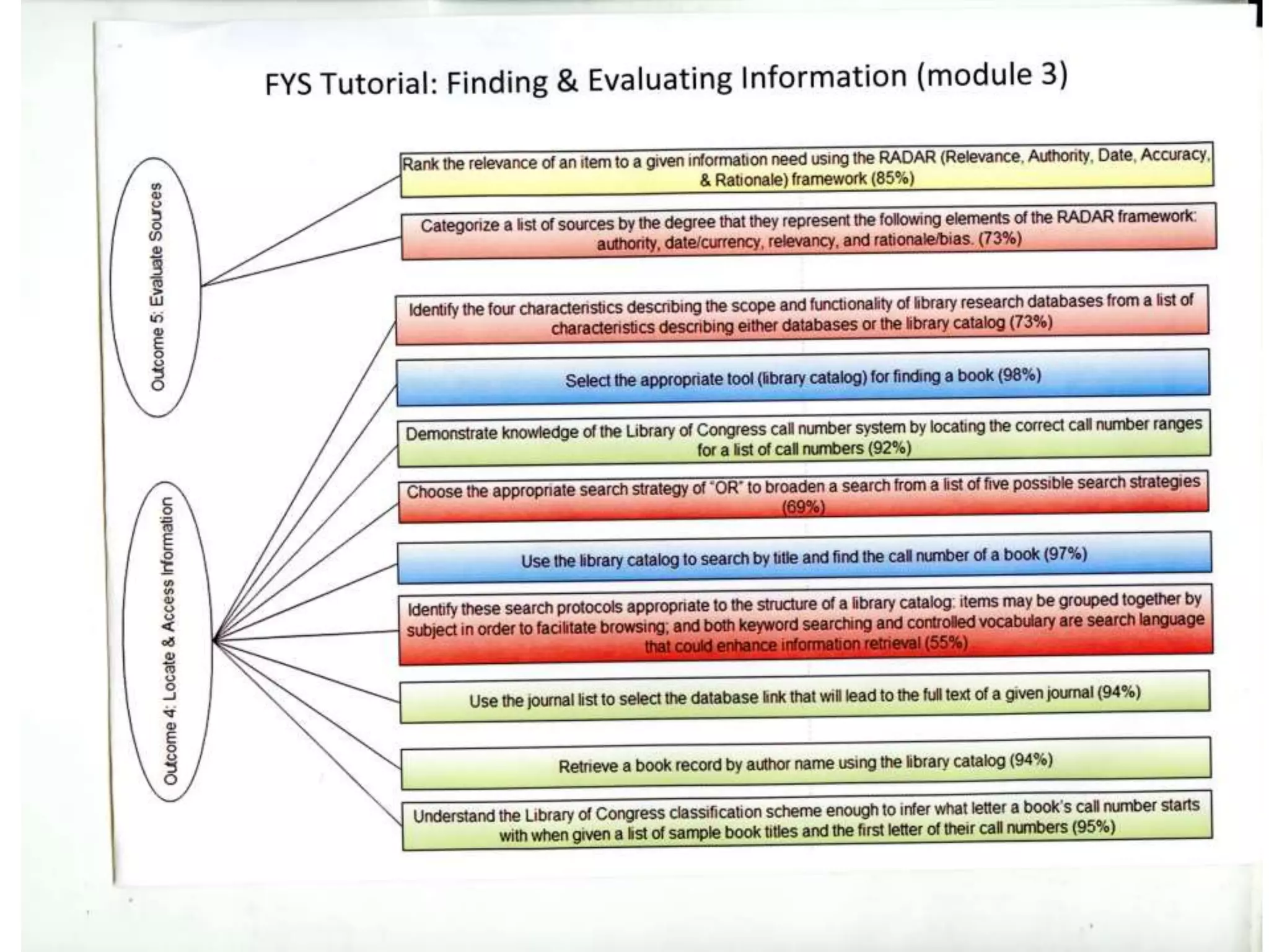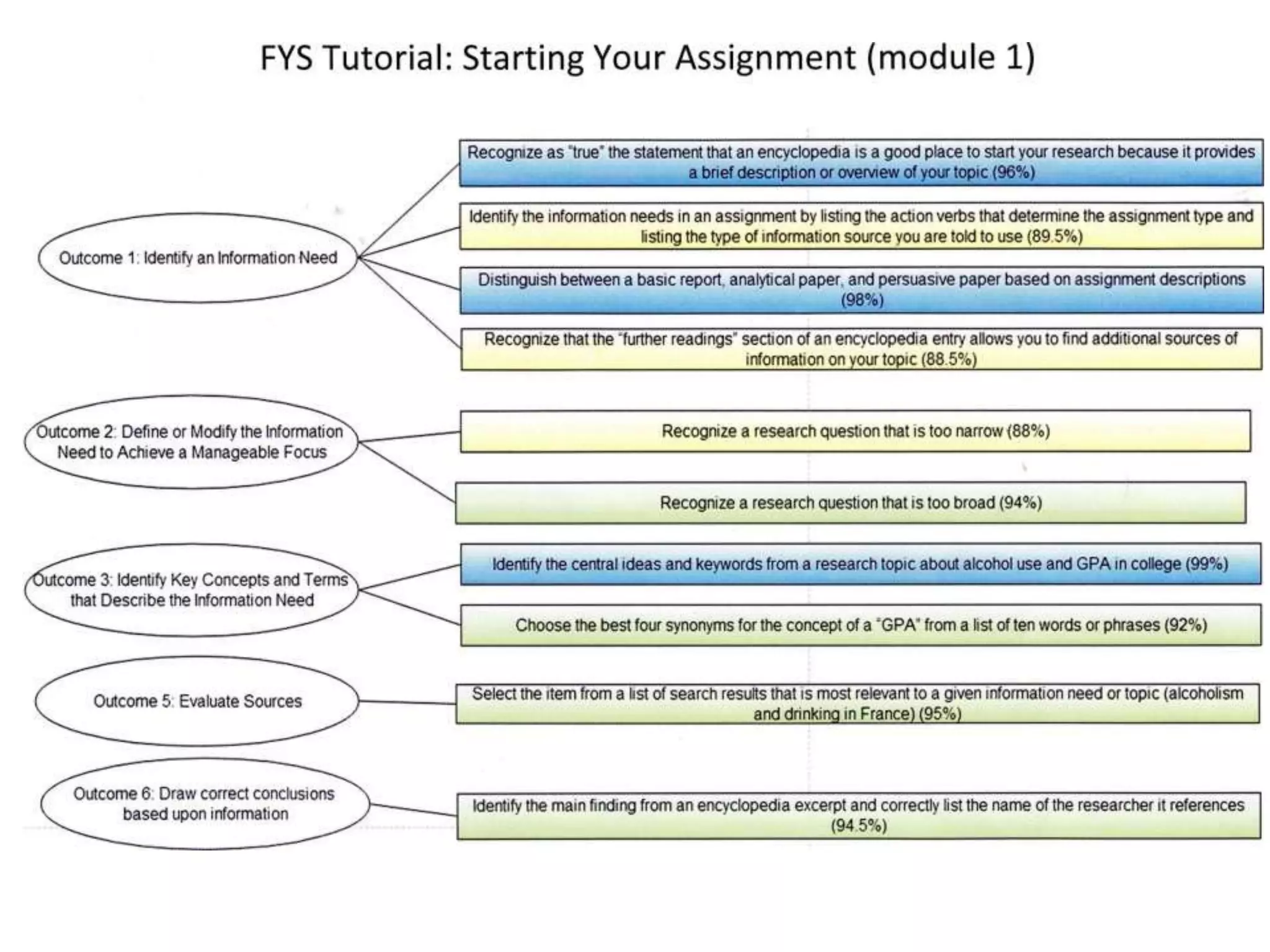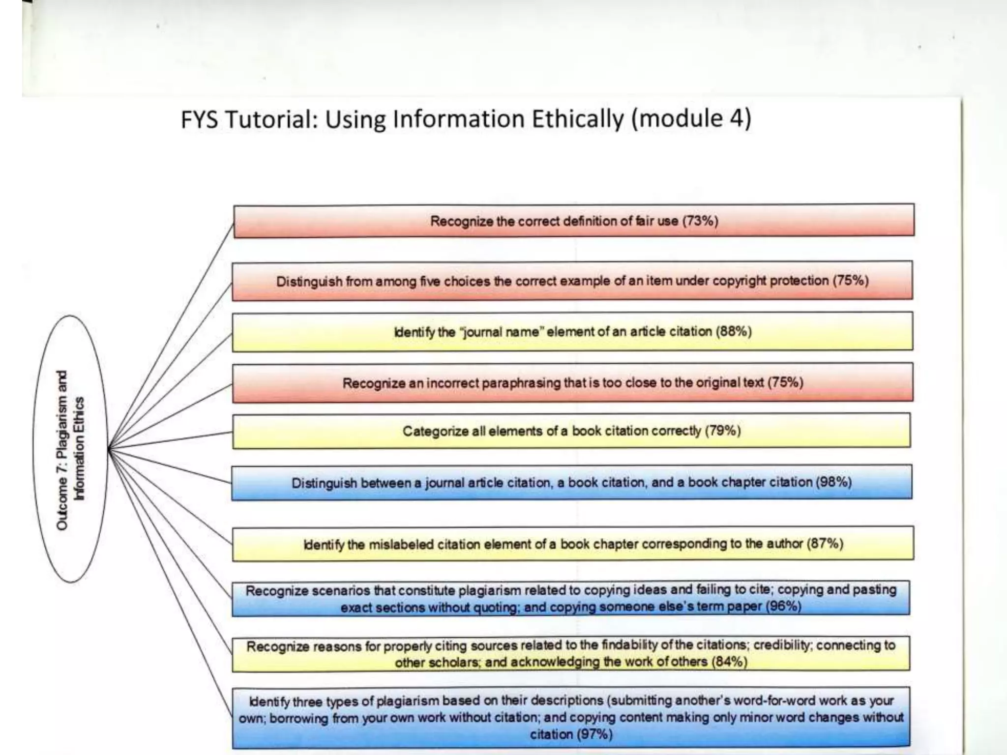 The document summarizes the results of assessing the effectiveness of an online information literacy tutorial for first-year seminar students at Loyola Marymount University. Overall completion rates and quiz scores were high, though some topics like evaluating sources had lower performance. Surveys found students and faculty found content on plagiarism and finding resources most helpful. However, both groups felt the tutorial could be better integrated into courses and have improved technical functionality. Based on the findings, improvements for 2014 included breaking content into smaller sections, addressing technical issues, and better aligning the tutorial with course assignments.