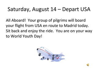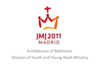 The document outlines the itinerary for a World Youth Day pilgrimage trip from August 14-23, 2010. The group will fly from the USA to Madrid, Spain and participate in catechetical sessions, the opening and closing masses led by Pope Benedict XVI, and an excursion to Avila. The anticipated total cost of the trip is $4,200 with a deposit of $1,000 due on June 30, 2010 and subsequent payments due on November 1, 2010 and February 1, 2011. The trip is being organized by the Archdiocese of Baltimore Division of Youth and Young Adult Ministry.