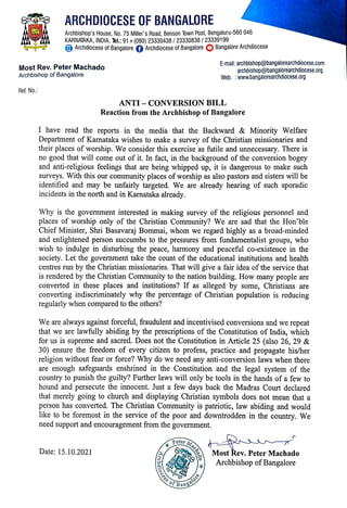 The Archbishop of Bangalore expresses concern over the Karnataka government's plan to survey Christian missionaries and places of worship. He argues that such surveys could unfairly target and endanger the Christian community. The Archbishop questions why only Christians are being surveyed, noting that Christians constitute a small percentage of the population. He calls on the government to respect constitutional protections of religious freedom and consider the educational and social services provided by Christian institutions instead of pursuing anti-conversion policies.
