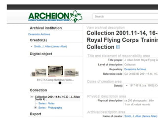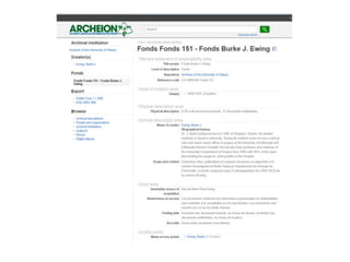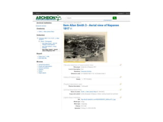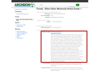 This document provides information about the Archeion Workshop. Archeion is Ontario's archive information network that holds over 8,000 archival descriptions from more than 70 institutions across Ontario. The workshop discusses the structure of Archeion, including how it separates institutional information, archival descriptions, and record creator information. It also reviews how to create and edit records in Archeion, including institutional records, authority records for creators, and archival descriptions at different levels. Tips are provided for writing concise and accessible summaries.