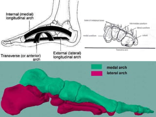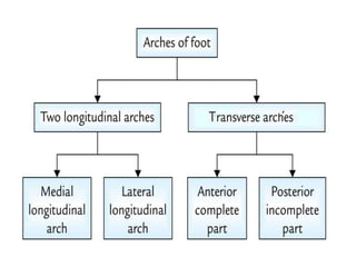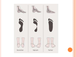 This document summarizes common foot abnormalities: flat foot, high arched foot, club foot, hallux valgus, and hammer toe. Flat foot is the most common and results from failure of the medial longitudinal arch. High arched foot is an exaggeration of the longitudinal arch. Club foot can be congenital or acquired and presents in various deformities that impact gait. Hallux valgus causes the big toe to deviate laterally at the metatarsophalangeal joint. Hammer toe involves hyperextension at some joints and hyperflexion at others, generally affecting the 2nd and 3rd toes.