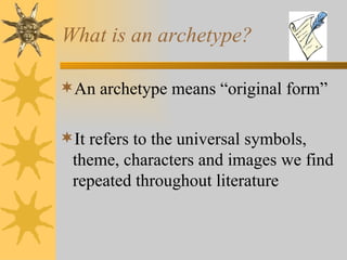 An archetype refers to universal symbols, themes, characters and images found across literature that reveal basic human truths. Archetypal criticism seeks to identify these recurring patterns and interpret them as manifestations of universal human experiences. Examples of archetypes include common literary tropes like the hero's journey, conflicts between order and chaos, and stock characters like the innocent youth, bully, or wise old man. Archetypal critics believe these patterns resonate with all people regardless of time or place.