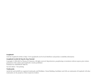 This document provides an introduction to the Graphisoft ArchiCAD Step by Step Tutorial. It discusses the concept of a virtual building as modeled in ArchiCAD, compared to traditional 2D CAD drafting. It also profiles how different architecture firms utilize ArchiCAD's virtual building tools in their design and documentation workflows. The introduction concludes by explaining how the step-by-step book and interactive content on the accompanying CD-ROM are intended to be used together to guide users through exercises to learn ArchiCAD.