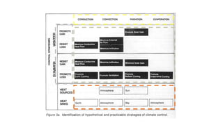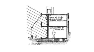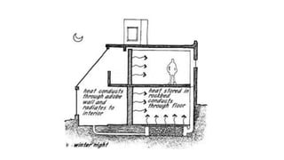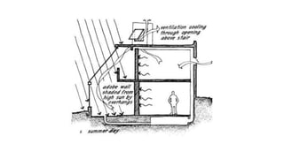 Vernacular architecture refers to traditional local architecture that uses locally available building materials and responds to the climate. It is characterized by simple, functional designs. The document discusses different climate types according to the Köppen climate classification system and provides examples of vernacular architecture and passive design strategies appropriate for each climate type. These include compact forms, solar orientation, natural ventilation, shading, and use of local materials for hot arid, hot humid, temperate, Mediterranean, and continental climates.