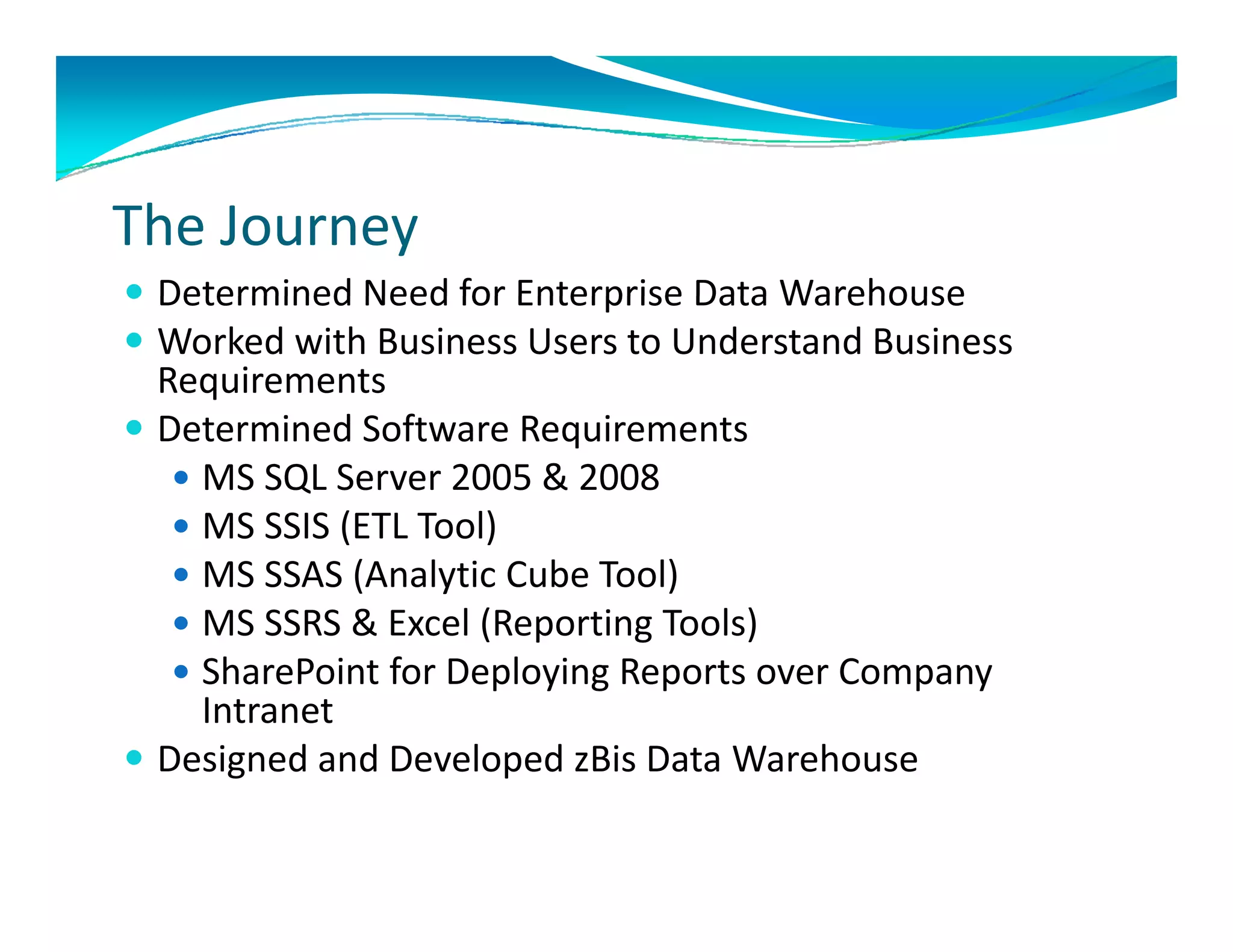 The document outlines the design and development of an enterprise data warehouse for Carl Zeiss Vision North America, emphasizing the need for consolidated and user-friendly reporting. It details the project approach, including the use of various Microsoft tools for ETL, analytics, and reporting, as well as the importance of understanding business processes and requirements. Additionally, it highlights the significance of dimensional design and the creation of star schemas for data management and analytics.