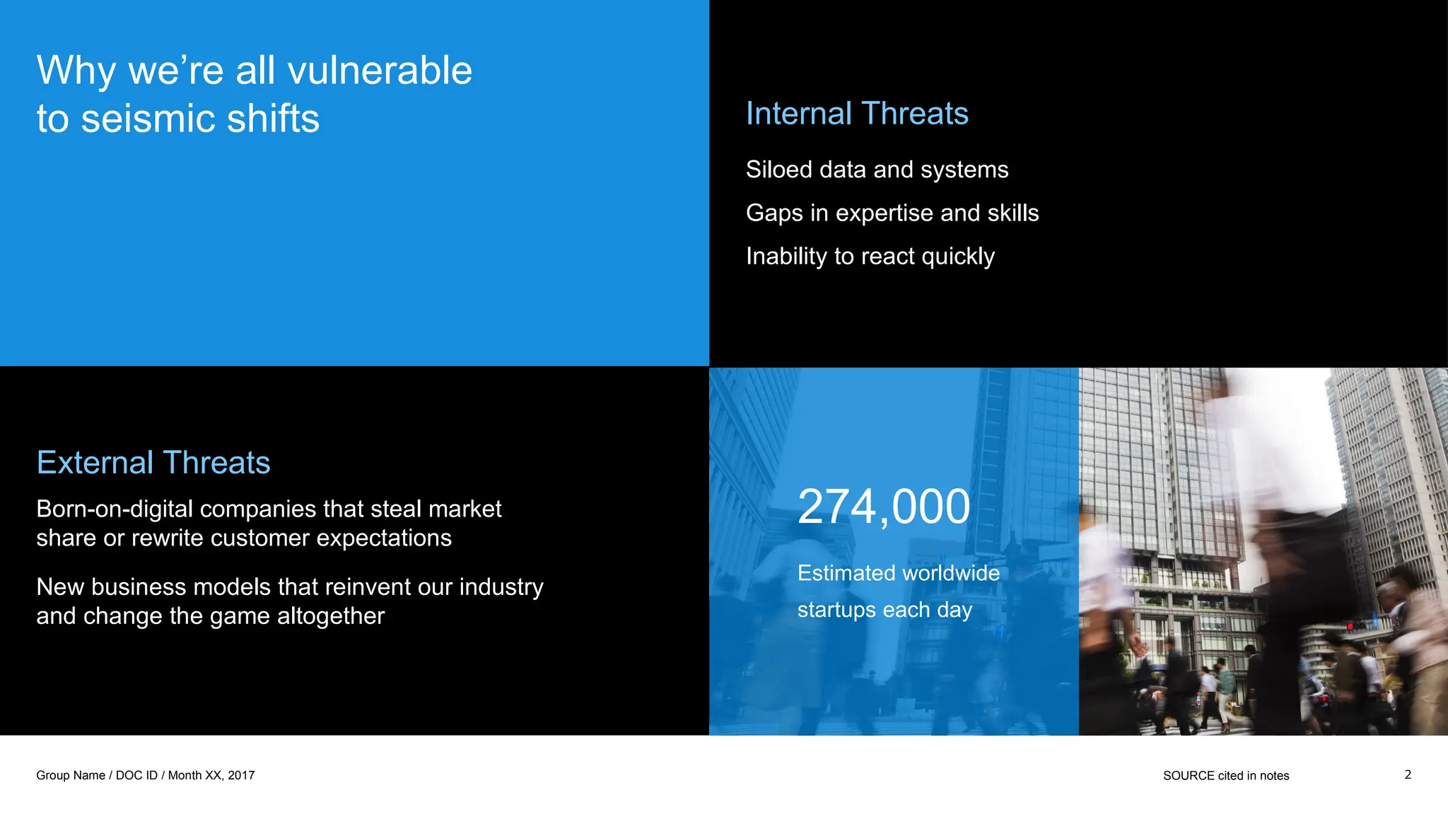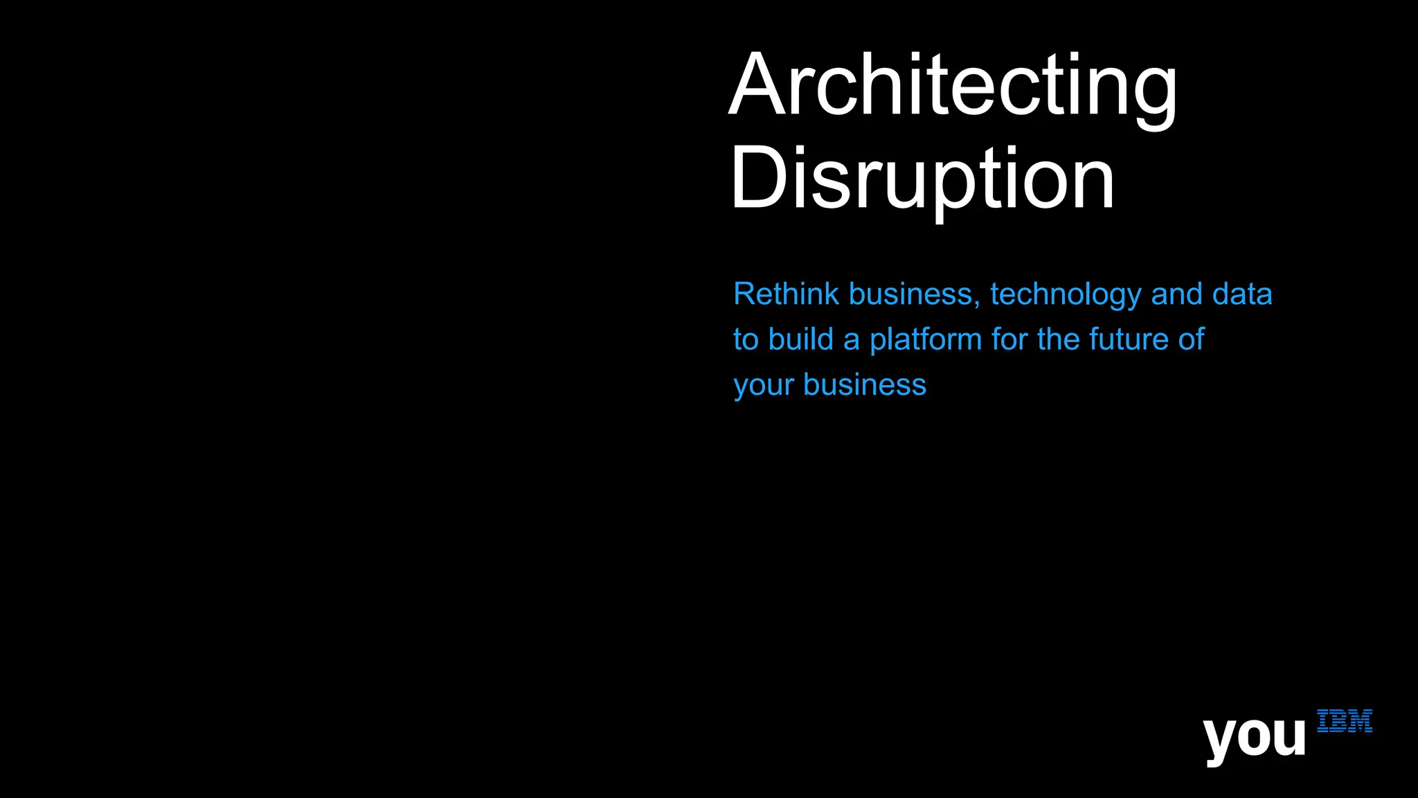 The document discusses the necessity for businesses to rethink their approach to disruption by integrating cloud and cognitive technologies to optimize infrastructure and innovate customer experiences. It emphasizes the importance of data management and utilizing advanced technologies (such as AI, IoT, and blockchain) to remain competitive amidst rapid market changes. Lastly, it highlights IBM's capabilities in providing an architecture engineered for disruption, aiming to digitally reinvent businesses for growth and a competitive edge.