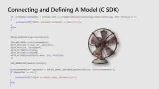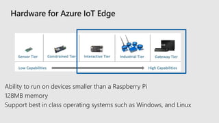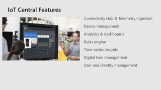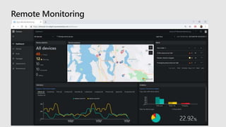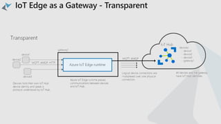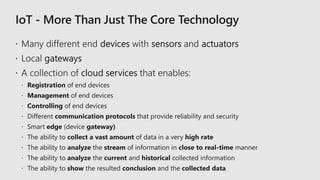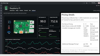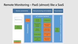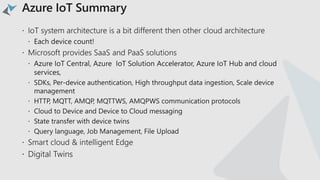 The document discusses the architecture and components of IoT solutions using Microsoft Azure, detailing various services such as Azure IoT Hub, Azure Machine Learning, and Azure Stream Analytics. It describes the communication and management of IoT devices, including device identity management, messaging systems, and analytics capabilities. Additionally, it outlines pricing tiers, operational limits, and integration with Azure's monitoring and diagnostic tools.