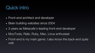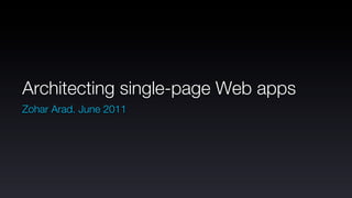 This document provides an overview of key concepts for building single-page web applications. It discusses client-server relationships, routing, views and content rendering, global event handling, dependency management, initialization and execution, form handling. The document emphasizes defining RESTful APIs, rendering HTML on the server when possible, using a dependency library like RequireJS, and following conventions to manage initialization and execution of code.