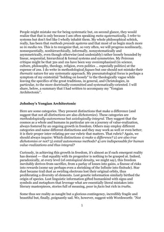 2) It presents a "Yongian Architectonic" of categories that make meaningful distinctions without creating dichotomies, and suggests reality involves an ongoing growth in freedom and value through emergent realities letting go of equality with their origins.