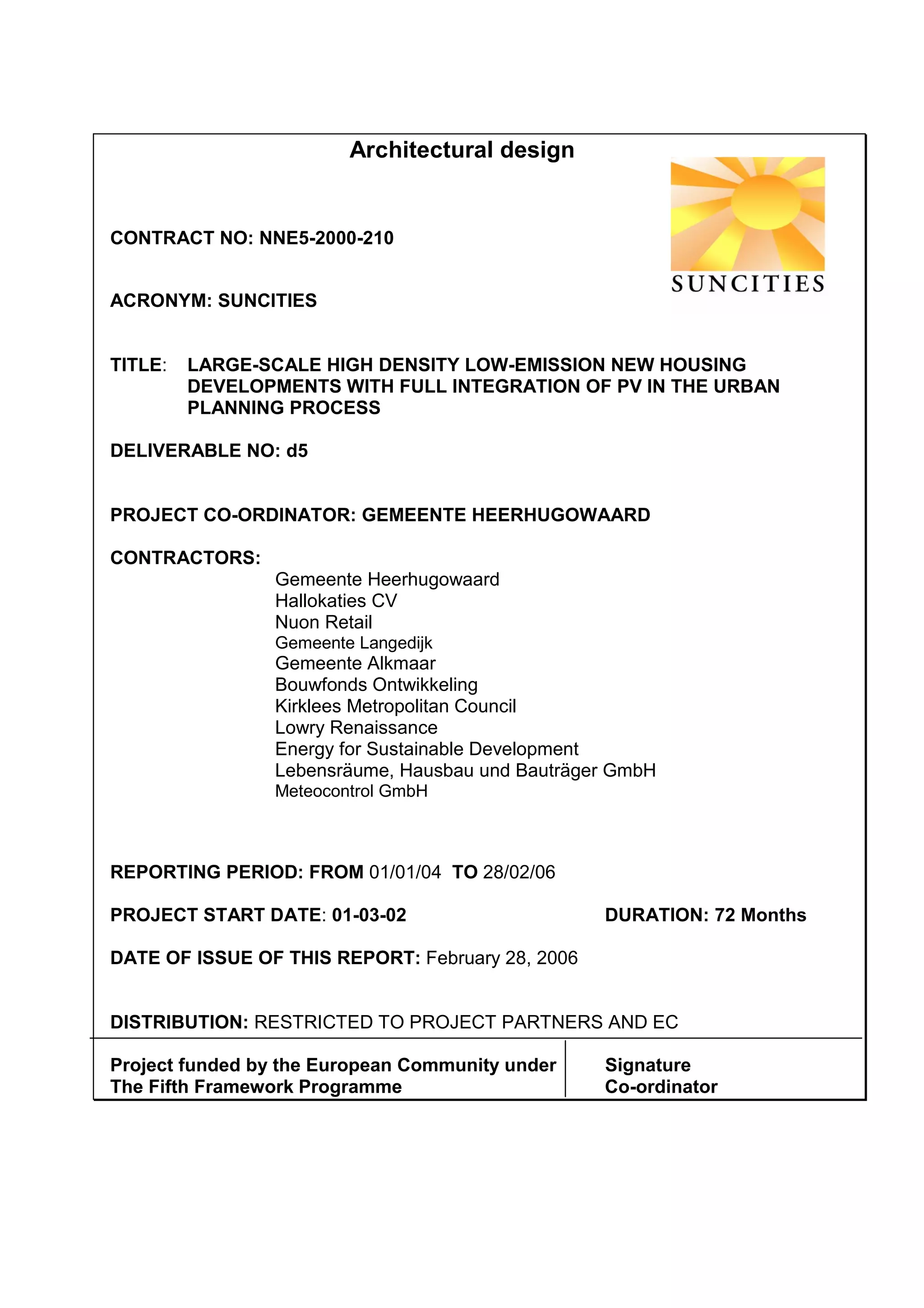 The document provides architectural designs and details of photovoltaic integration for housing developments in the Netherlands, United Kingdom, and Germany from 2002-2006 as part of the SunCities project. A variety of housing types are shown with photovoltaic systems integrated into roofs or mounted on structures, ranging from 0.38 to 3.6 kilowatts per home. The designs demonstrate different levels of photovoltaic integration into building designs across the three countries.