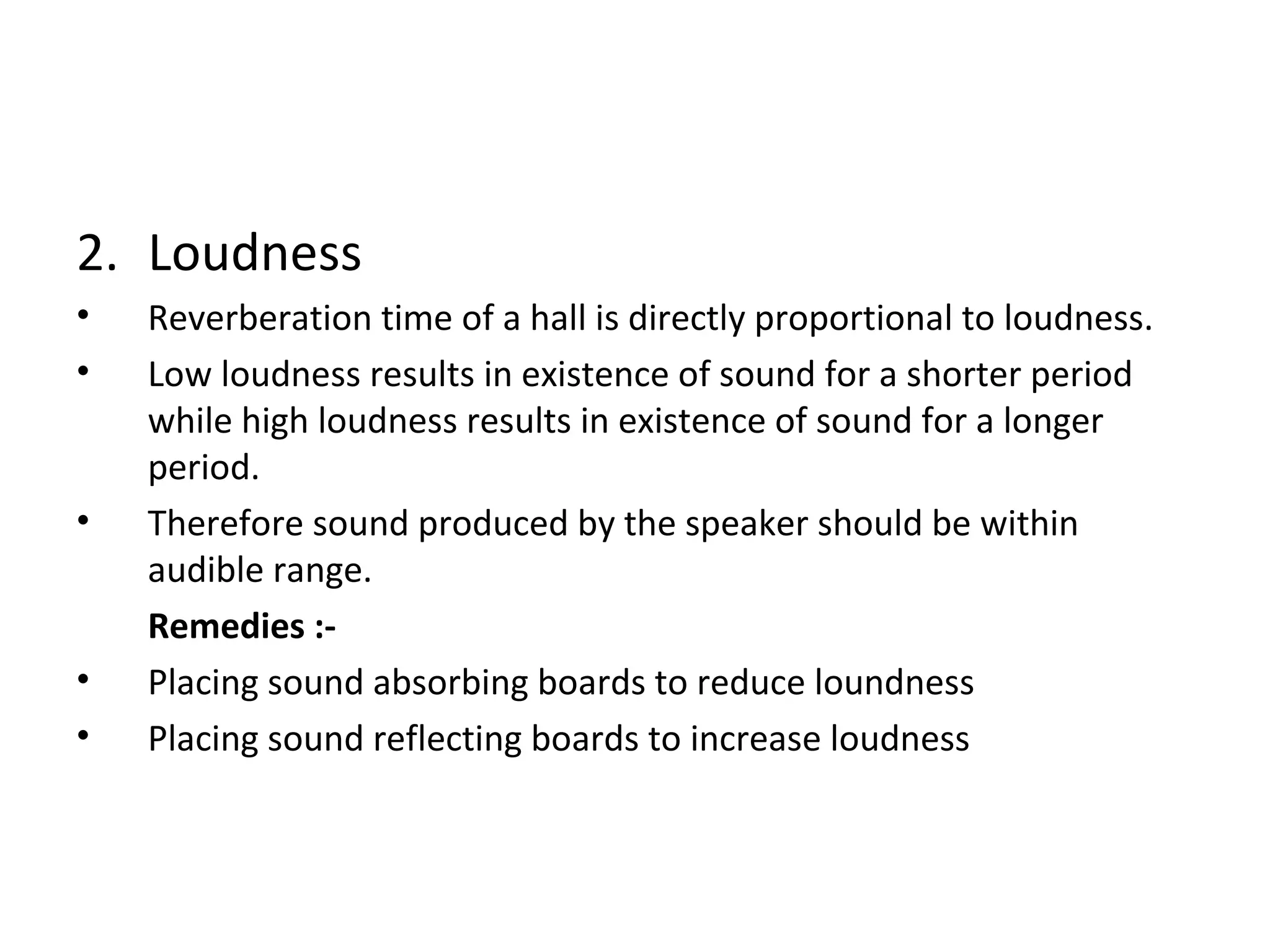 This document discusses factors that affect architectural acoustics, including reverberation time, loudness, echo effects, structure-borne sound, focusing of sound waves, and resonance. It explains how each factor impacts sound quality and lists remedies such as using sound absorbing or reflecting materials on walls and ceilings to optimize reverberation time and loudness or prevent echoes and focusing of sound waves. Modeling acoustic effects in a water tank can help design actual halls to avoid unwanted resonance.