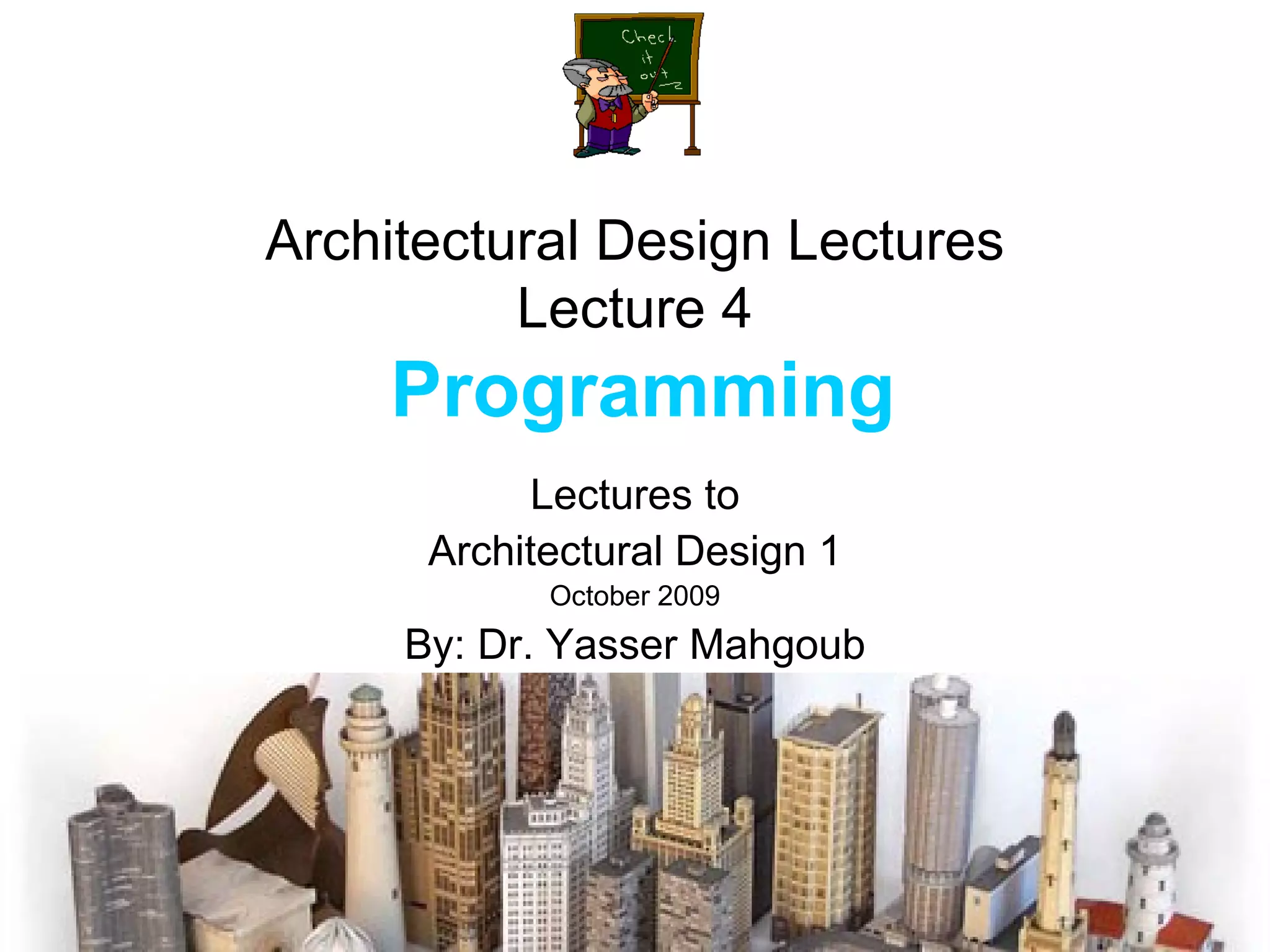 Architectural Design Lectures Lecture 4   Programming Lectures to Architectural Design 1 October 2009 By: Dr. Yasser Mahgoub