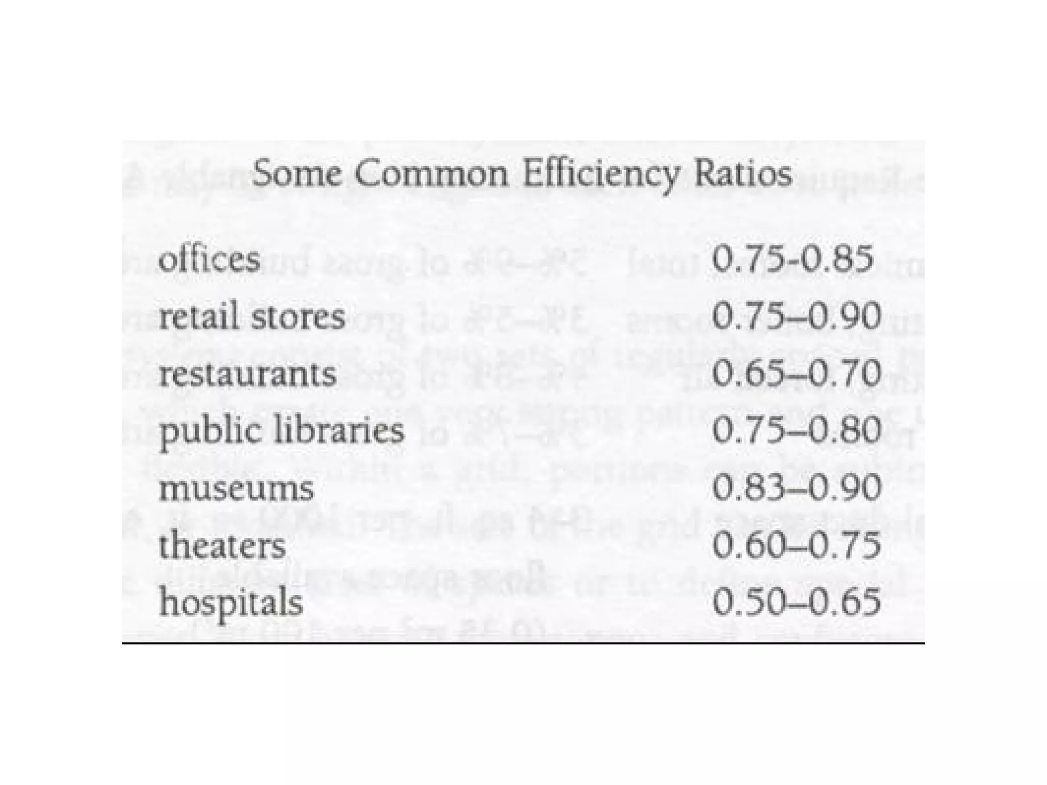 Space Identification and Allocation Building efficiency Very substantial  percent  of the building area Net-to-Gross Ratio  or Building Efficiency Varies significantly for different  building types If it is accounted for incorrectly, it can have a significant  negative impact on building quality .