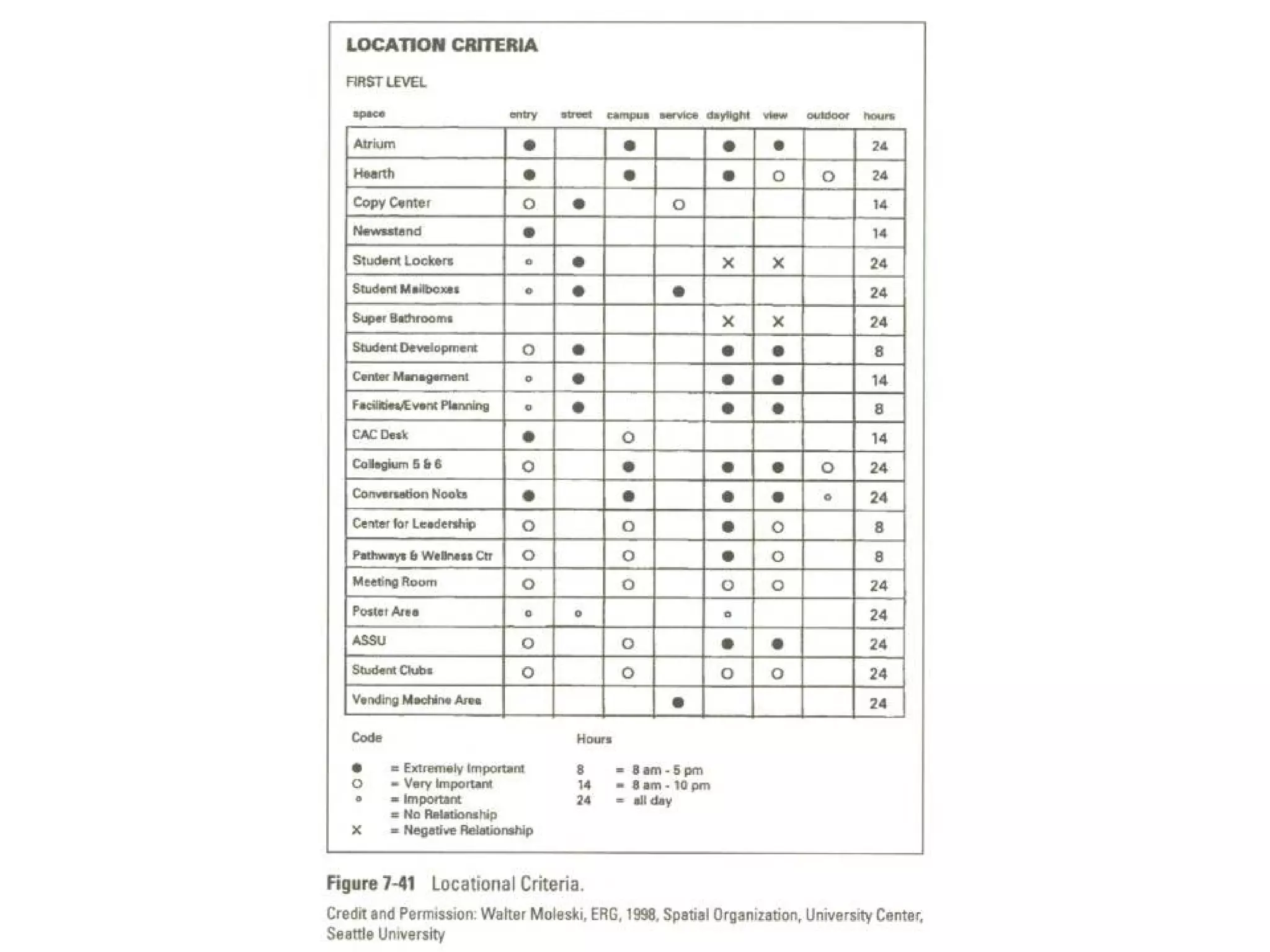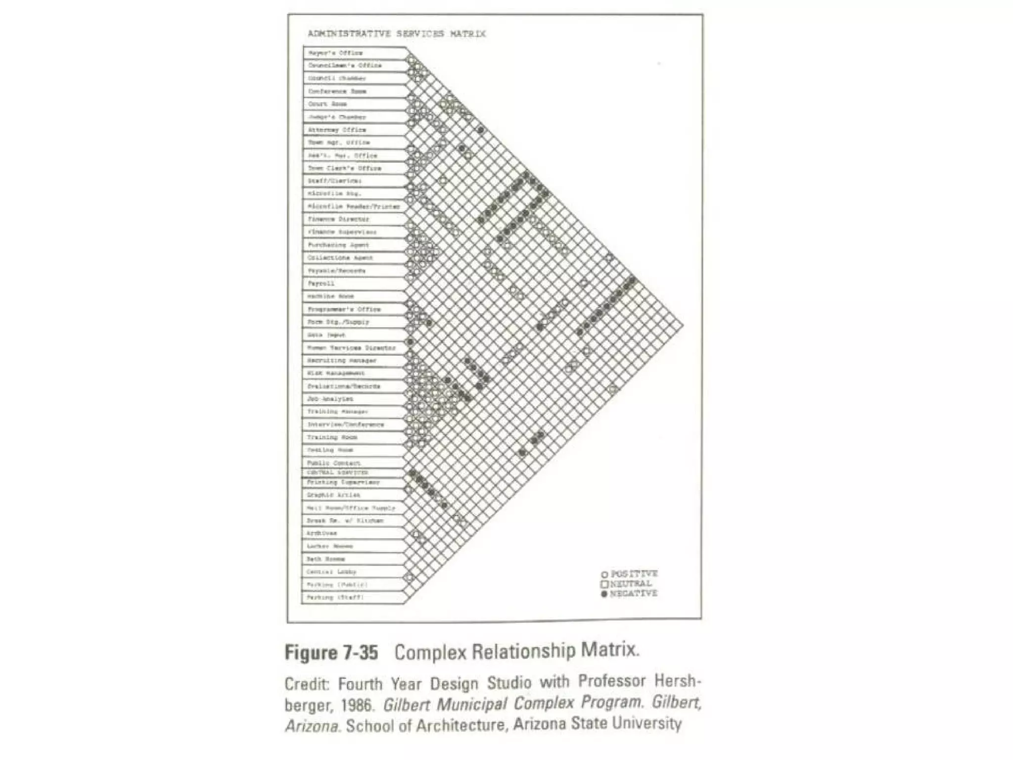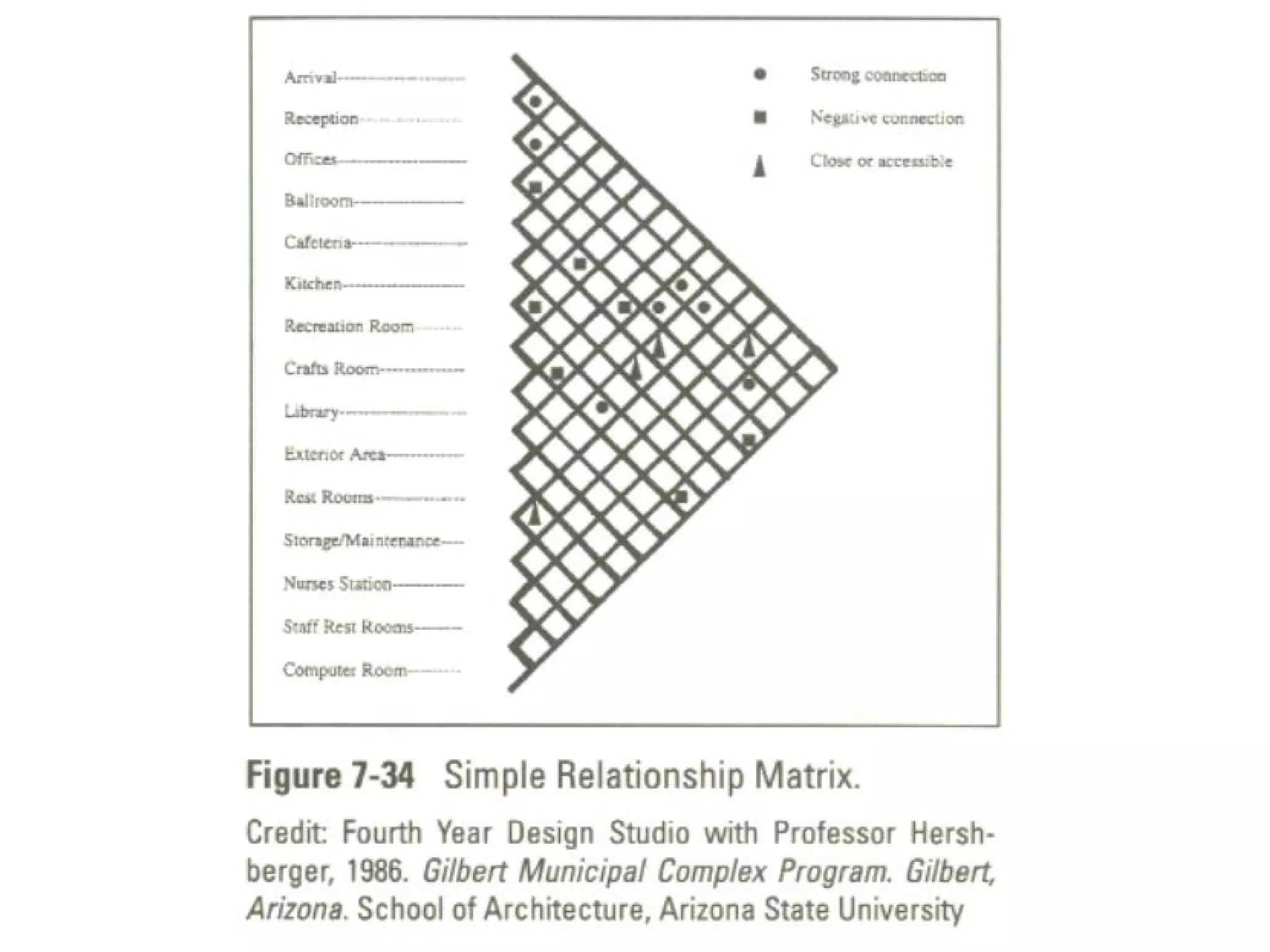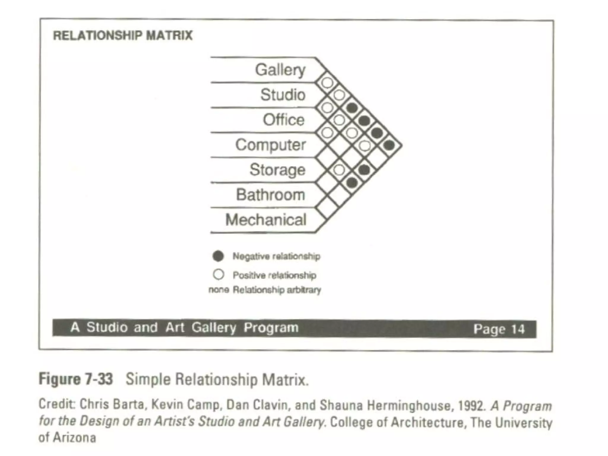 Relationship Matrices Relationshipmatrix develop and show how various spaces relate. Every identified space is located vertically along one side of the matrix. Lines at a 45-degree angle to the end of each identified space extend to provide one cell connecting each space to every other space. A simple distinguishable code can be used to show the nature of the relationship between the spaces.