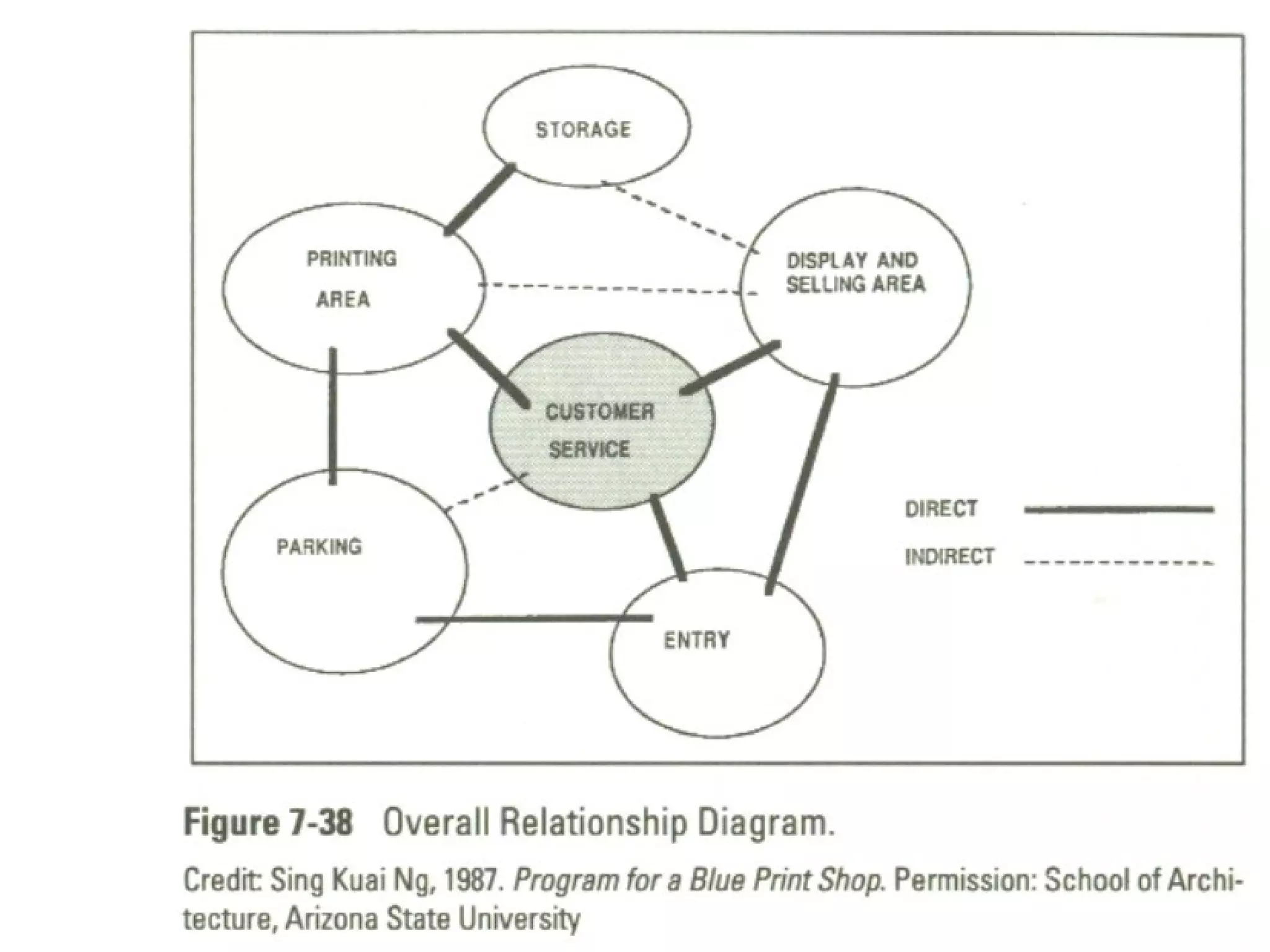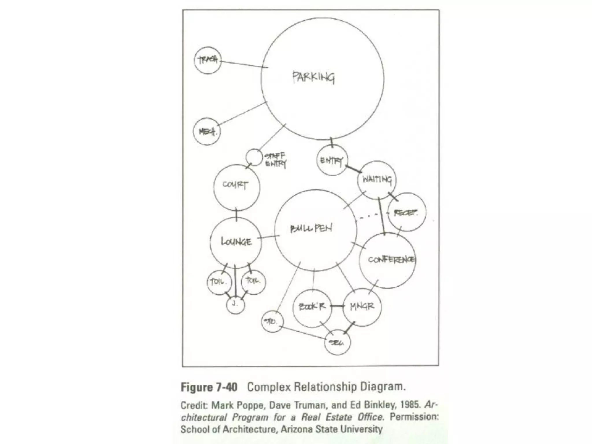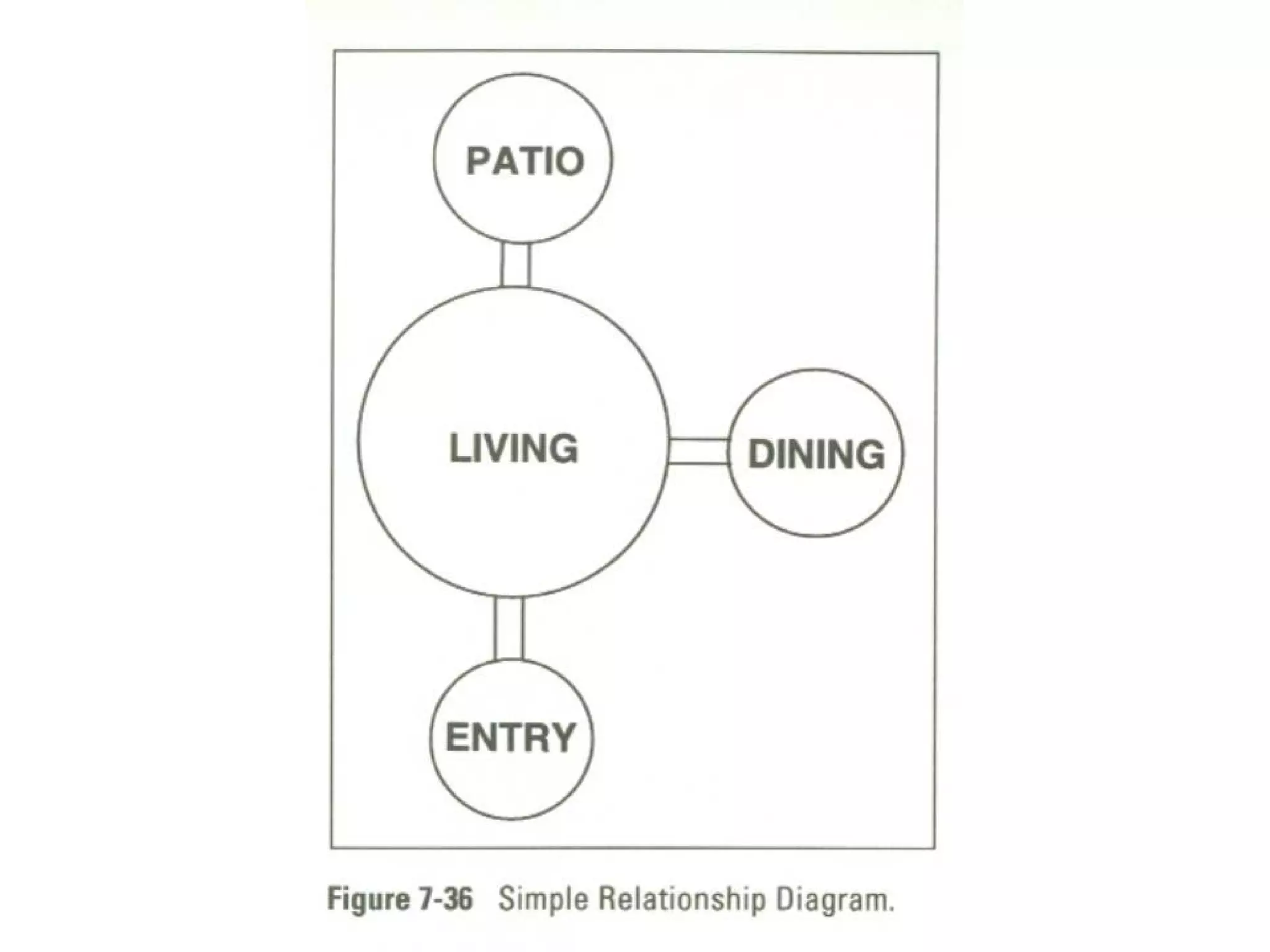 Relationship Diagrams Smallcircles or “ bubbles ” each of which contains the name of one of the identified spaces. The bubble representing the space under consideration is drawn first, then other spaces relating to it are indicated in additional bubbles placed near the first bubble. Heavy , medium, and light-weight lines can be used as a code to indicate strong, moderate, and weak relationships.