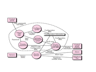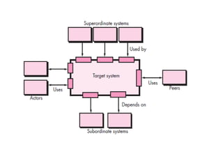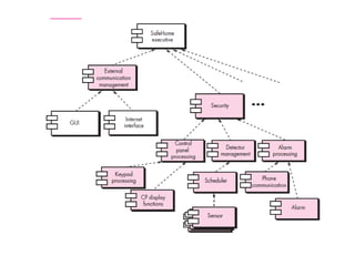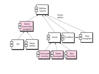 The document discusses architectural design, including software architecture, architecture genres, styles, and design. It covers topics such as what architecture is, why it's important, architectural descriptions, decisions, genres like artificial intelligence and operating systems, styles like layered and object-oriented, patterns, organization/refinement, representing systems in context, defining archetypes, refining into components, describing instantiations, and assessing alternative designs.