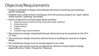The document provides guidance for an architecture design maquette/diorama project. It outlines the objectives and requirements, which include utilizing at least 2 techniques from previous projects, submitting proposal and progress reports, and presenting the final design on a 23"x17" base. The design cannot be an ordinary house and must consider elements of design like unity, scale, proportion, and balance. It then provides examples and explanations of these elements, including varieties of unity (grid, pattern, color, minimal), scales (human, intimate, monumental), textures, and balances (dynamic/static, symmetry/asymmetry). Historic and modern architecture examples are shown. The document concludes with references for additional information.