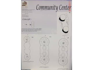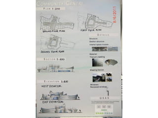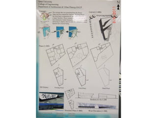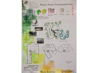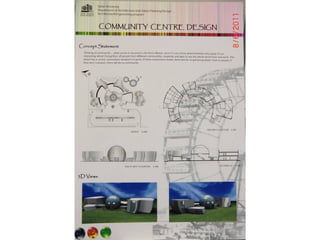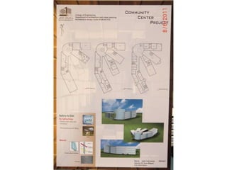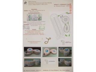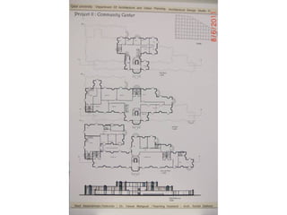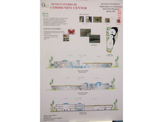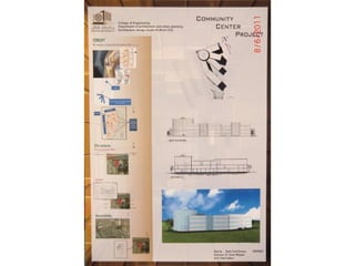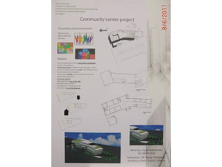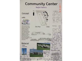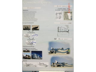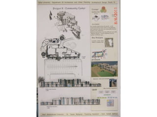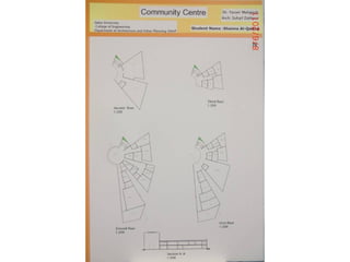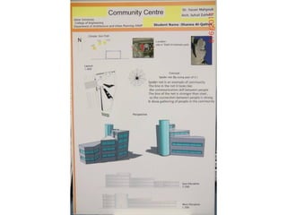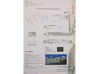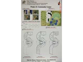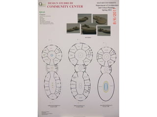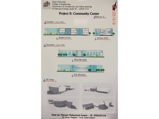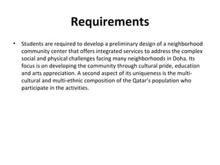 The document outlines a project for architectural design students at Qatar University, focusing on developing a neighborhood community center in Doha. The center must encompass various zones for children, youth, elderly, and females, along with general and administrative areas, while adhering to Qatar's sustainability standards. Students are required to conduct extensive research and produce detailed architectural drawings to support their designs.