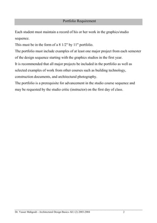 The document outlines the basics of architectural design taught by Dr. Yasser Mahgoub, including key topics, assignments, and exercises. It covers elements of architecture, environmental and human factors, building systems, history and theory of architecture, related disciplines, and the skills of analysis, creativity, composition, visualization, and communication through drawings. Students are assigned exercises to practice freehand sketching, organizing shapes using points lines and planes, bas-relief carving, using grids, and abstraction techniques. The goal is to develop students' knowledge, abilities, and technical skills in architectural design.