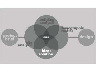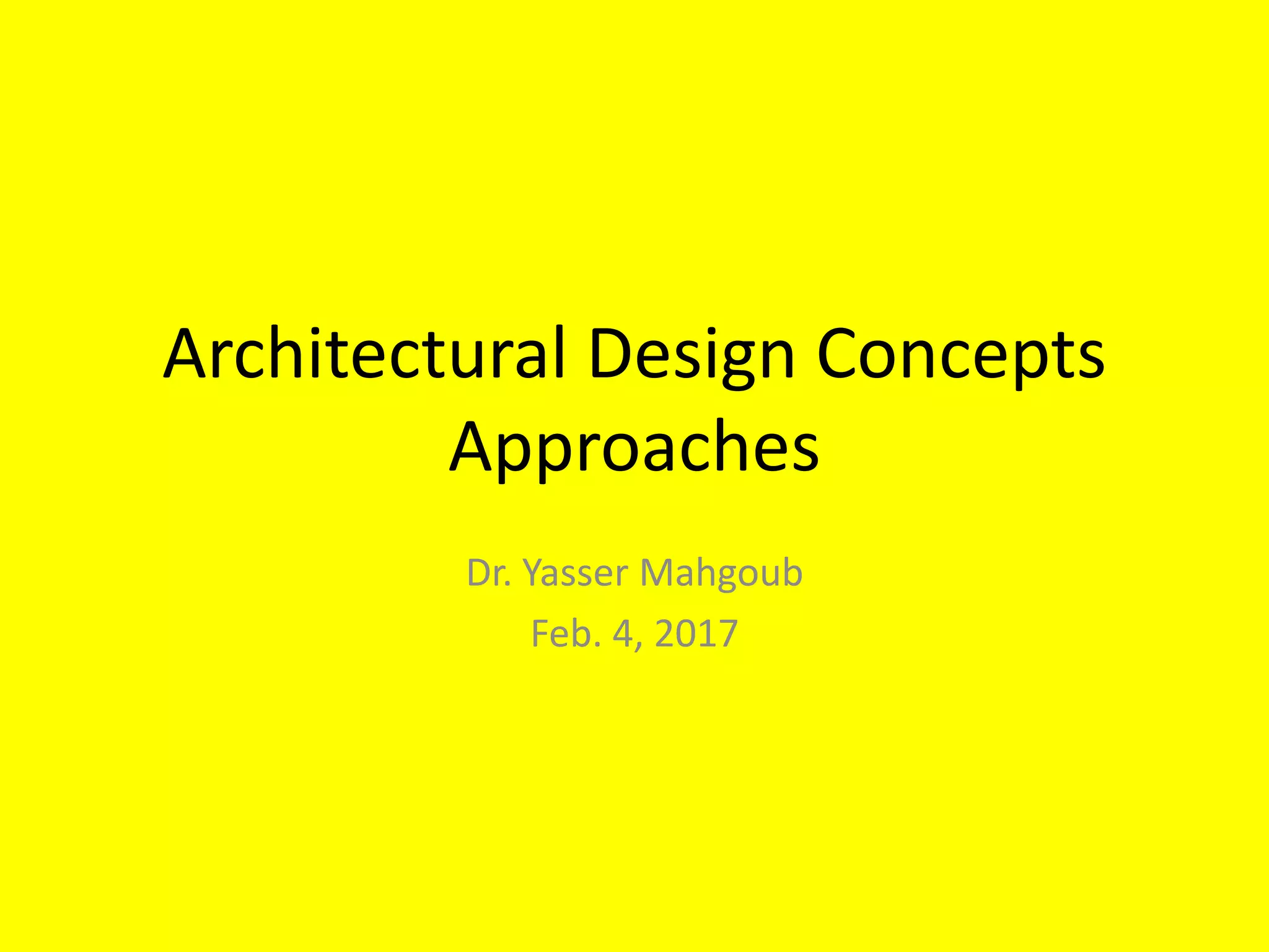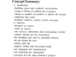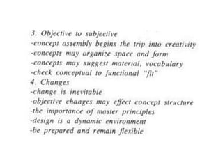 The document discusses architectural design concepts, emphasizing the importance of integrating various elements to formulate a cohesive concept that respects project goals and characteristics. It outlines different approaches to design, such as concept-based, issue-based, and theoretical frameworks, while highlighting the significance of creativity and problem-solving in effective design processes. The text further examines various design forces, methods, and criteria essential for crafting meaningful architectural solutions.