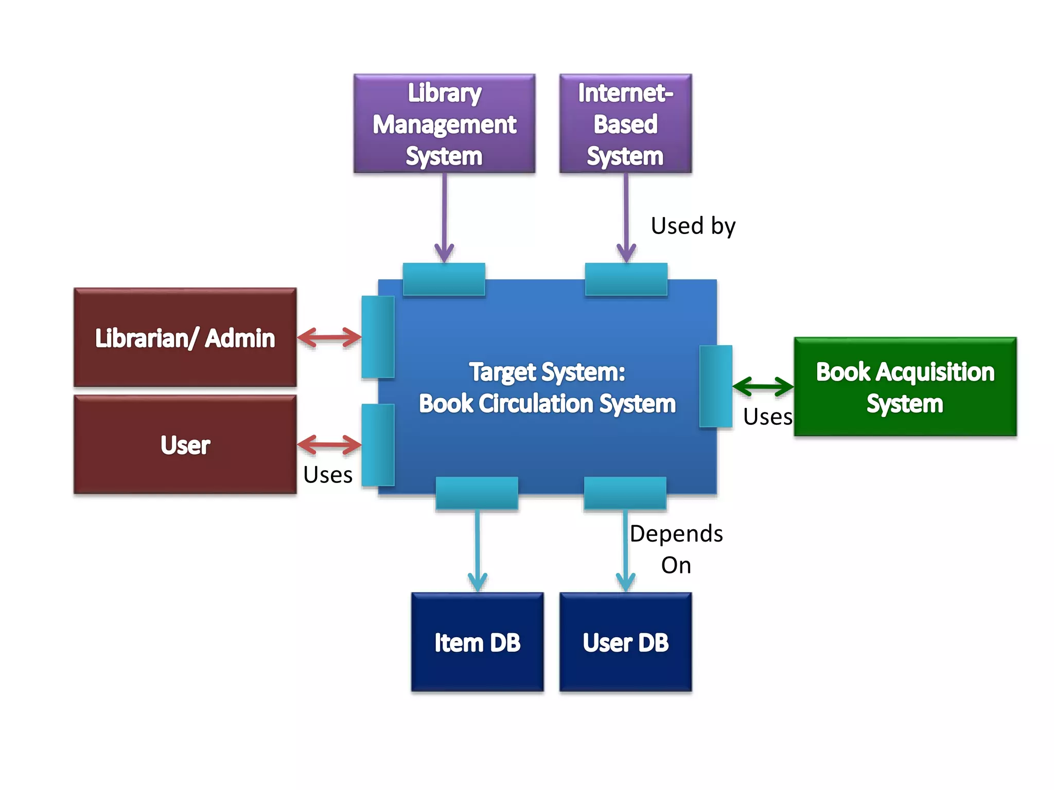 This document outlines the components and functions of a library management system. It includes administrative and user roles with different identification numbers that can perform functions like adding, editing, and deleting data. The system also depends on a database to store information on items, users, and other data needed to manage the library.