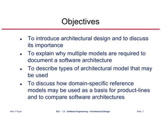 The document discusses architectural design in software engineering. It introduces architectural design and explains its importance for establishing the overall structure of a software system. It notes that multiple models are required to fully document a software architecture and describes different types of architectural models that can be used, such as control models and modular decomposition. The document also discusses how domain-specific reference models can be used as a basis for product lines and compares software architectures.