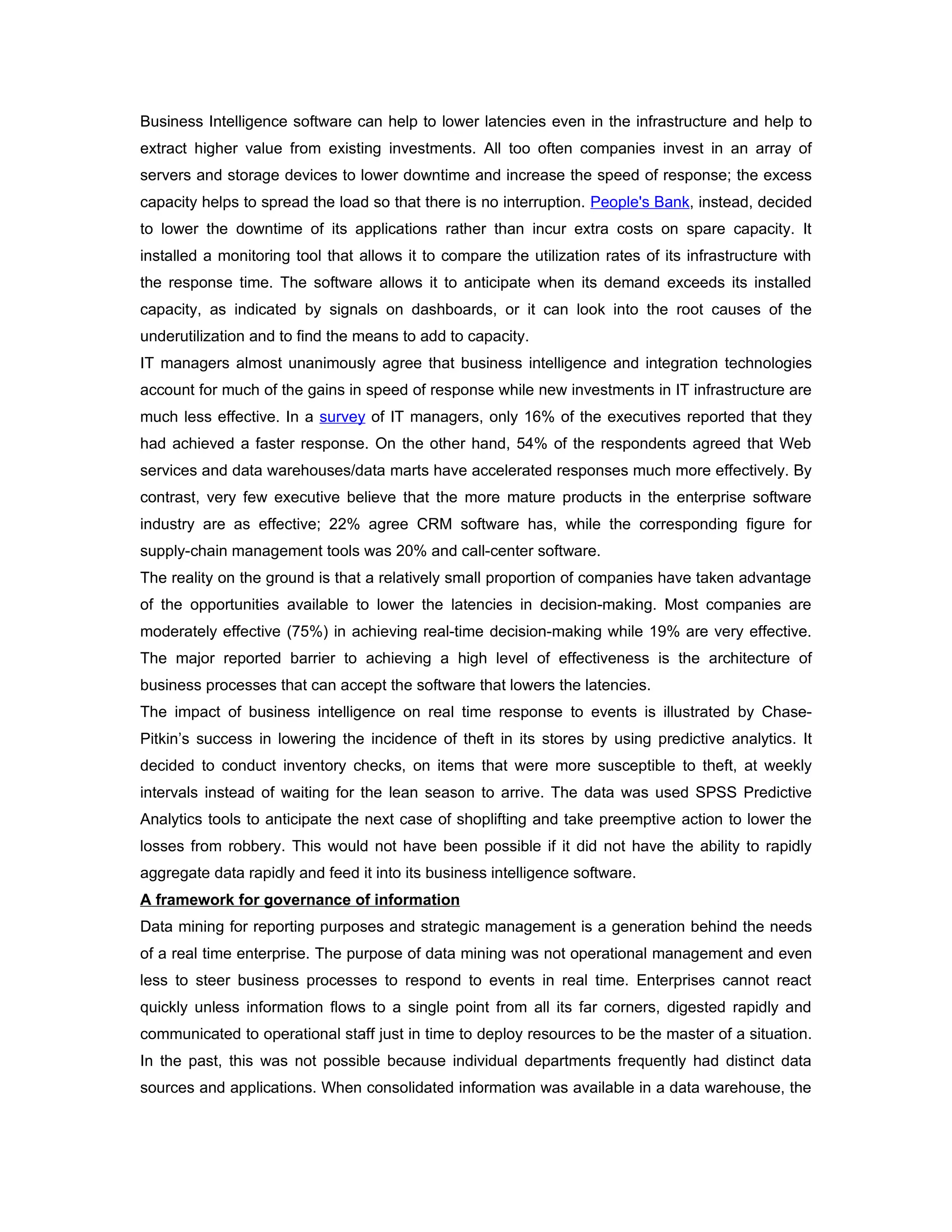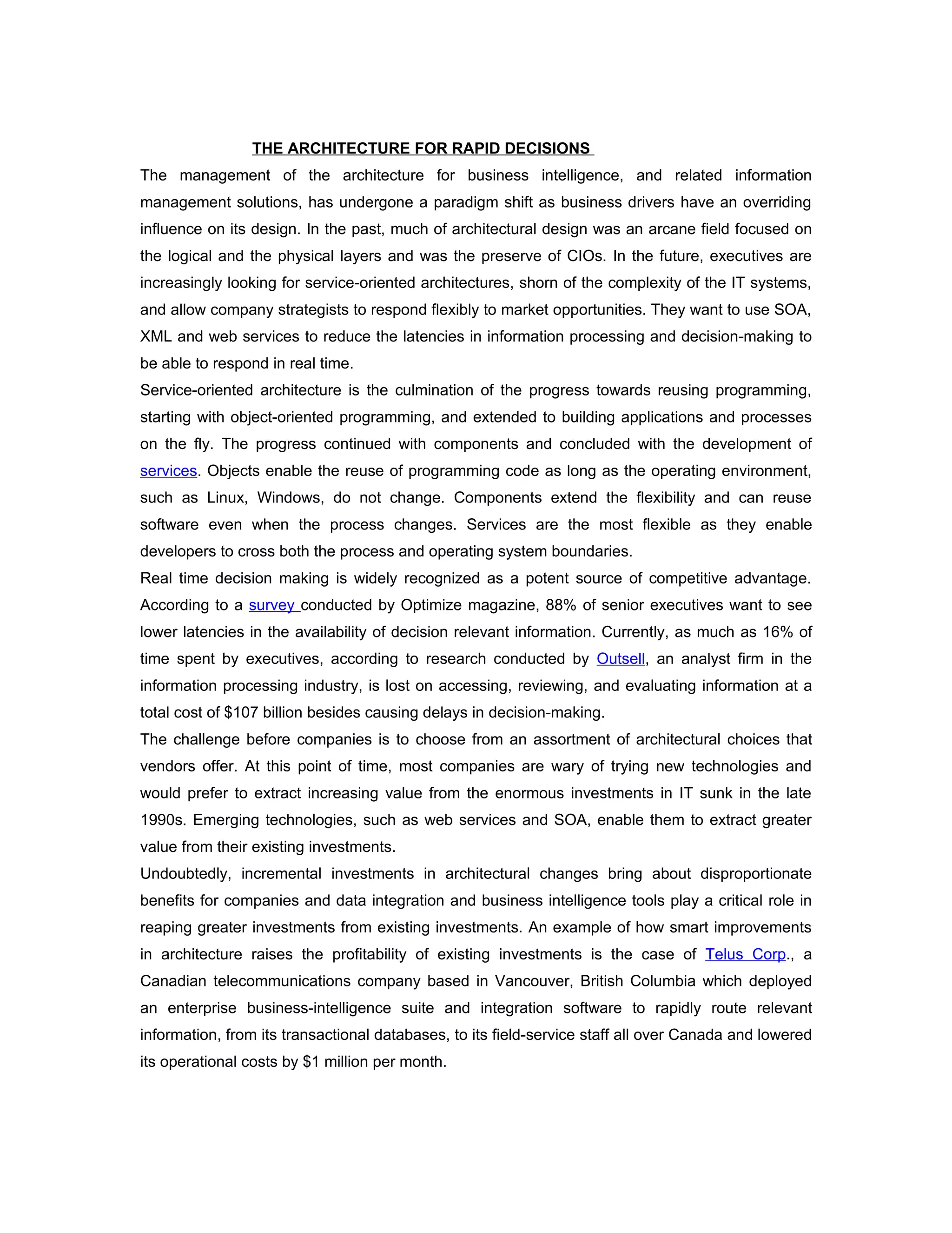 The document discusses the evolution of business intelligence architecture towards service-oriented architectures (SOA) that enhance real-time decision-making capabilities and reduce information processing latencies. It emphasizes the importance of leveraging existing IT investments through integration tools and business intelligence software to optimize operations, illustrated through examples like Telus Corp and Chase-Pitkin's predictive analytics. Furthermore, it highlights the need for enterprise governance models that seamlessly connect and manage heterogeneous information assets to create a more responsive and agile organizational structure.