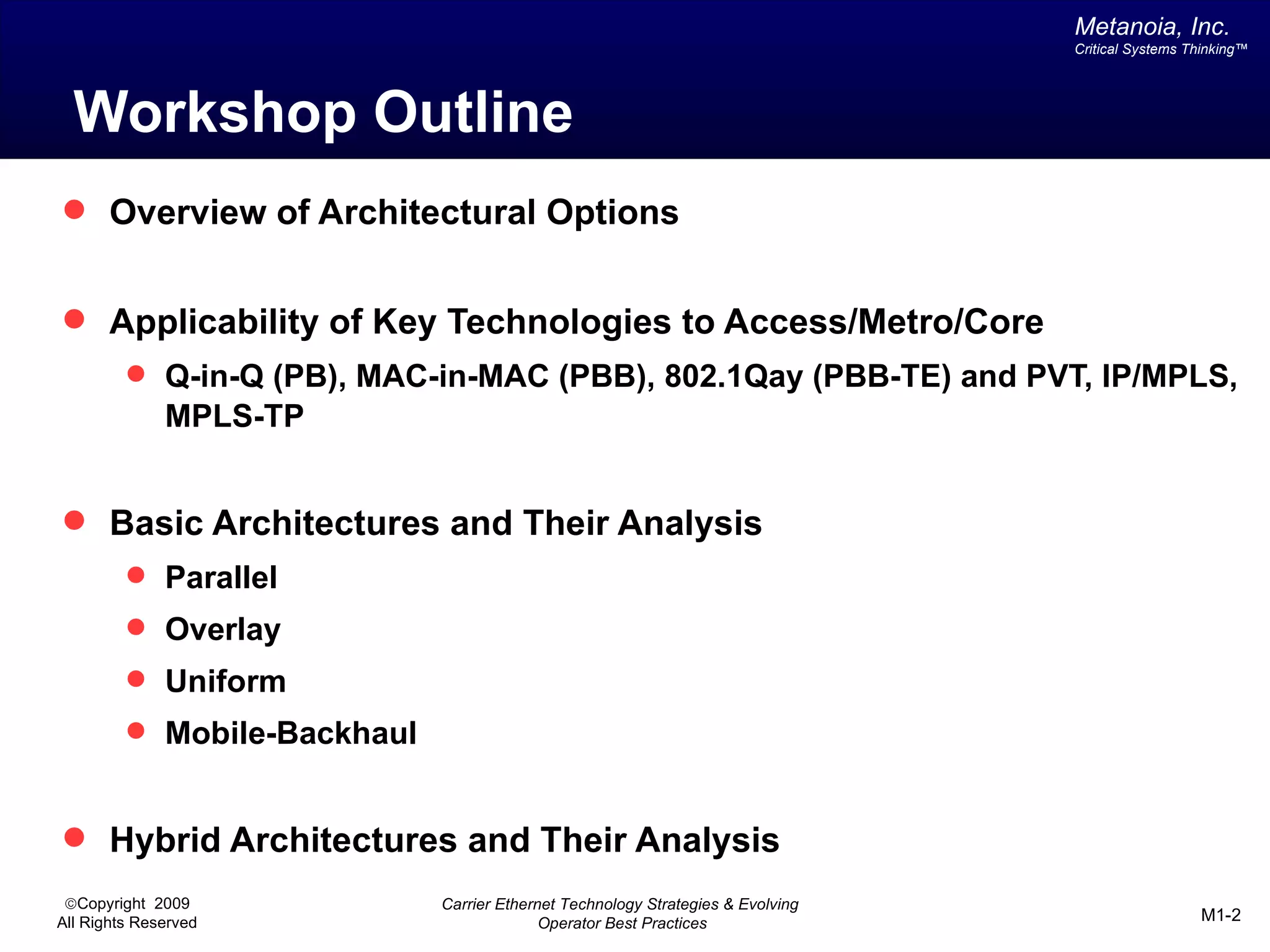 The document outlines various architectural options for metro carrier-ethernet network buildouts, focusing on the applicability of key technologies and analysis of basic architecture types such as parallel, overlay, uniform, and hybrid networks. It also includes a comparative assessment of technologies suited for metro access, aggregation, and core segments, utilizing a rating scale for their effectiveness in those contexts. The analysis further elaborates on the practical considerations of each architectural choice in terms of capital and operational expenses, flexibility, and management complexity.