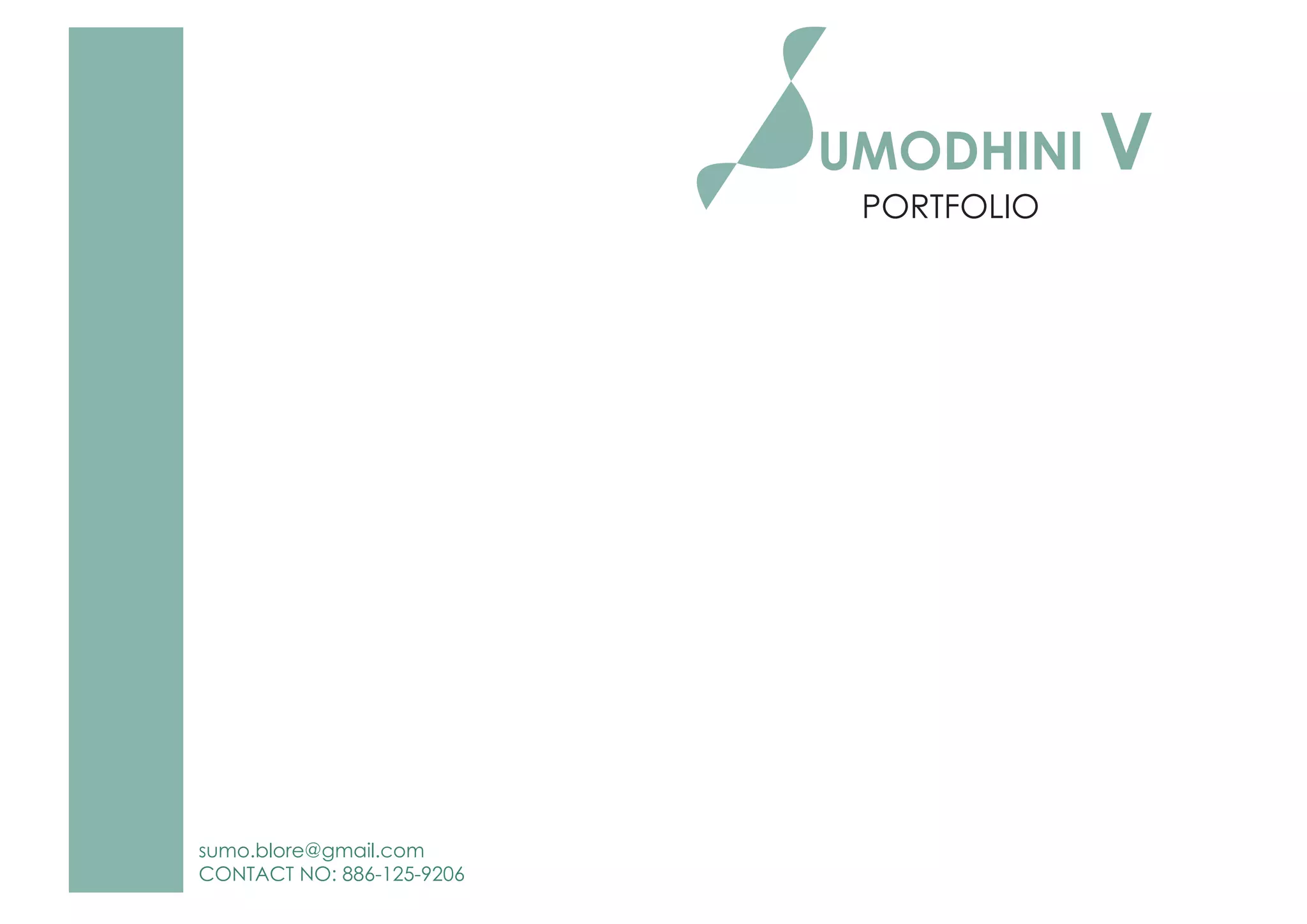 The document contains an architectural portfolio for Sumodhini V that includes her contact information, education history, works, skills, and design projects. Her objective is to gain experience in architecture and become a successful architect. Her works include documentation of temples in Hampi and Gavipuram. Her skills include AutoCAD, ArchiCAD, and languages. Her design projects include a public pier and museum, heritage information centre, villa, performance arts centre, innovation centre, transit station, and sustainable residence.