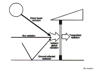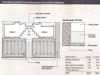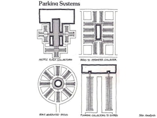 The document outlines the importance of site analysis in the design process, detailing its role in evaluating existing or potential sites with respect to development goals, environmental impacts, and community implications. It includes various aspects such as zoning, parking requirements, site evaluation, and environmental considerations crucial for effective project planning and execution. Additionally, it emphasizes the need for collaboration among multidisciplinary teams and highlights the significance of thorough analysis in optimizing site utilization and compliance with regulatory standards.