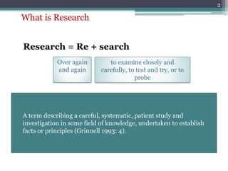 The document provides an overview of different types of architectural research, including historical research, qualitative research, correlational research, and experimental research. It discusses the key characteristics, tactics, strengths, and weaknesses of each type of research. Historical research involves the systematic collection of data to explain events from the past. Qualitative research focuses on words and pictures to understand participants' perspectives. Correlational research examines relationships between variables, while experimental research uses treatment variables and control groups to test causality. The document also provides examples of how each type of research has been applied to architectural design problems.