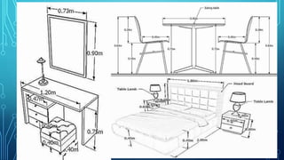 This document contains architectural standards and dimensions for interior spaces, furniture, and fixtures. It includes human scale drawings, different ways to draw doors, and how to measure objects with hands. Specific interior standards are provided for elements like stairs, kitchens, living rooms, bathrooms, sinks, showers, and more. Furniture dimensions are listed for areas like living rooms, bedrooms, dining rooms, and bathrooms. The document also outlines right and wrong ways of placing furniture, painting, using spaces, and dimensions for items like billiard tables, ping pong tables, and televisions.