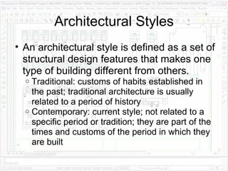 The document discusses different architectural styles including traditional and contemporary styles. Traditional styles are related to specific historical periods while contemporary styles are part of current design trends. Some traditional styles discussed include English Tudor, French Mansard, French Provincial, Early American, American Colonial, Western Ranch, and Western Adobe. Key features of different styles like roof design, exterior materials, and floor plans are provided. Contemporary styles borrow elements from traditional styles but are not defined by a single historical period.