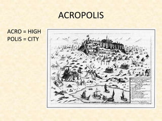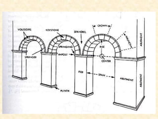 The document defines and provides brief descriptions of various architectural terms. It includes definitions for common structures like acropolis, agora, adobe, aisle, arcade, and attic. It also defines architectural elements like arch, architrave, awning, balcony, balustrade, baptistery, basement, bay, bay-window, buttress, cantilever, chattris, clearstorey/clerestory, coffer, colonnade, cornice, and courtyard. The document serves as a reference for basic architectural terminology.