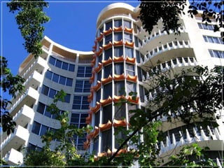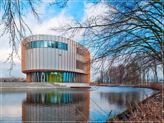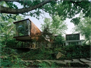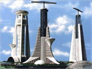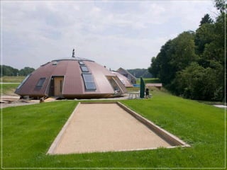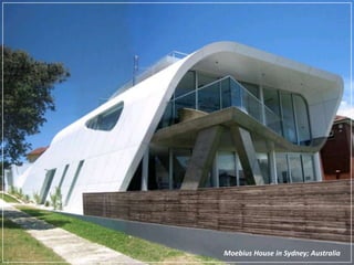 This document provides a visual overview of various modern architectural designs from around the world, including residential and commercial buildings as well as entire planned developments. Some highlights include Javier Senosiain's undulating "Quetzalcoatl Nest" house in Mexico, spherical structures like the "Mushroom House" in California and "Bubble House" in France, and large-scale projects like the "City of Arts and Sciences" complex in Valencia, Spain. The document showcases the diverse and innovative directions of modern architecture globally.